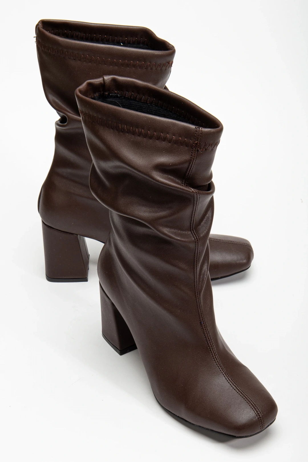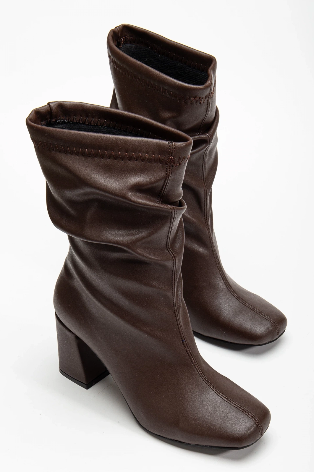 kadın kahverengi streç deri sivri burun fermuar detaylı topuklu bot