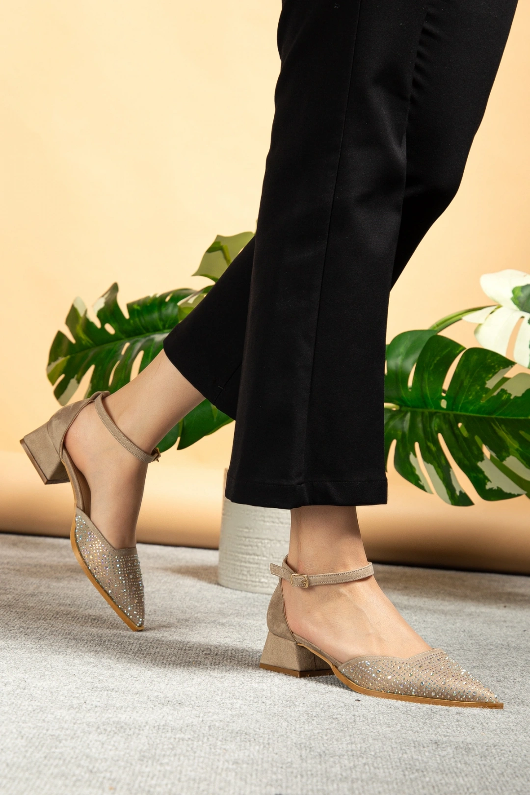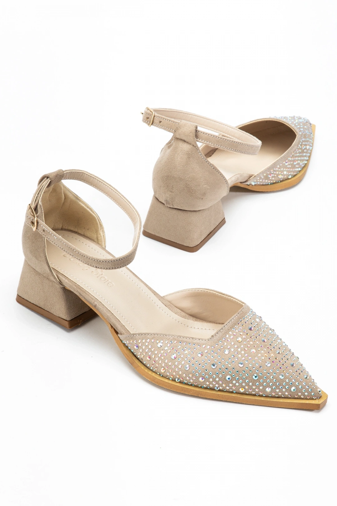 Kadın Bej Parlak Taşlı Süet Kumaş Kısa Topuklu Ayakkabı
