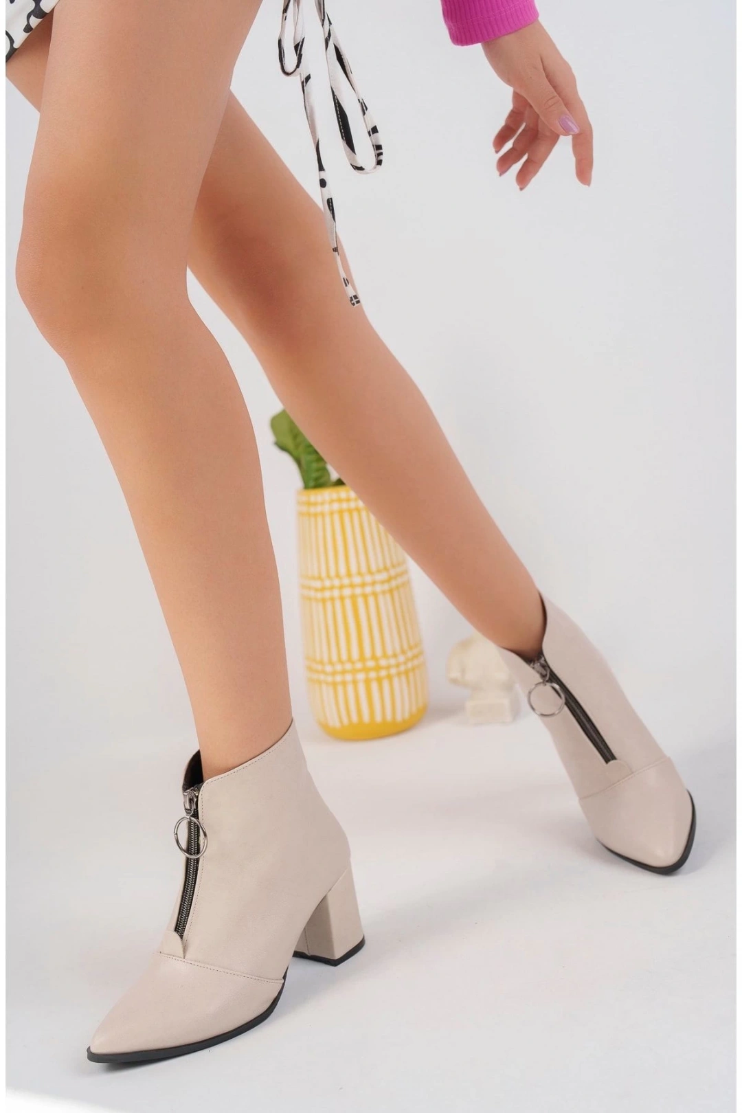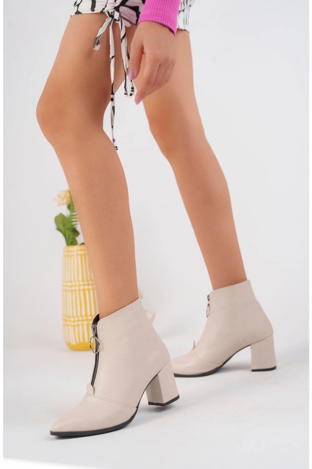 Kadın Bej Arkadan Fermuarlı Sivri Burun Metal Detaylı Topuklu Bot