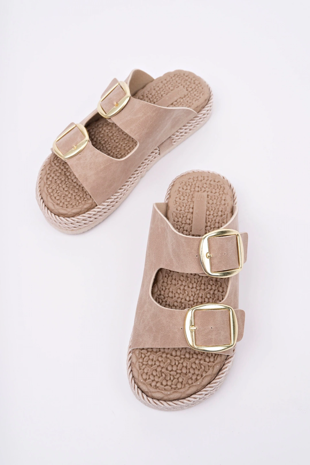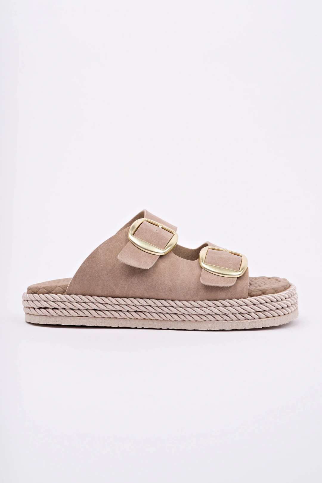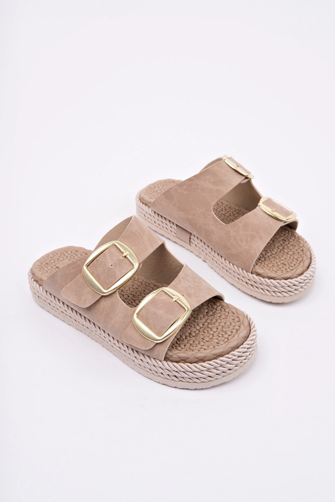 Kadın Bej Günlük Çift Tokalı Rahat Taban Hasır Sandalet Terlik
