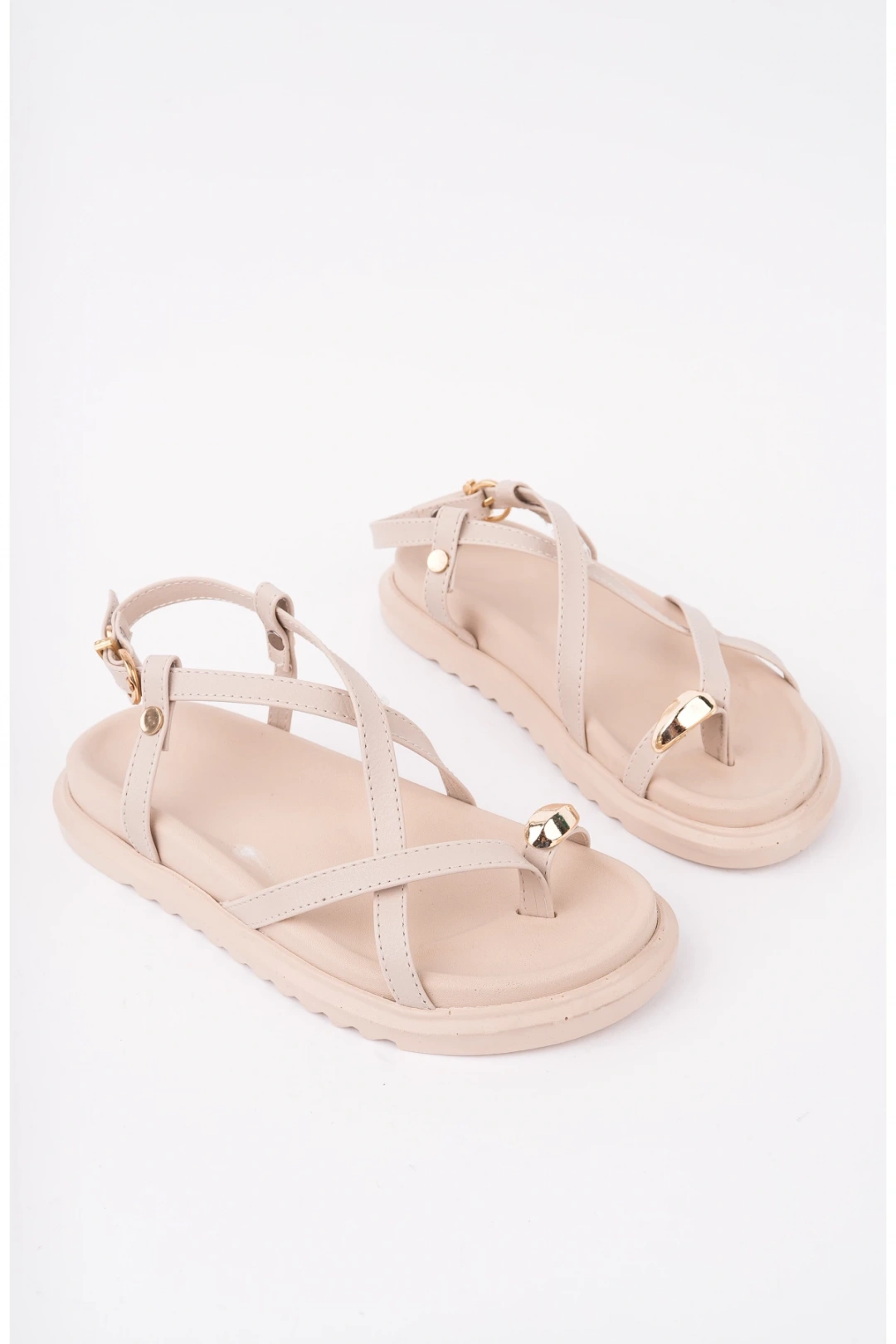 Kadın Bej Günlük Gold Yüzük Ince Çapraz Bantlı Parmak Arası Sandalet