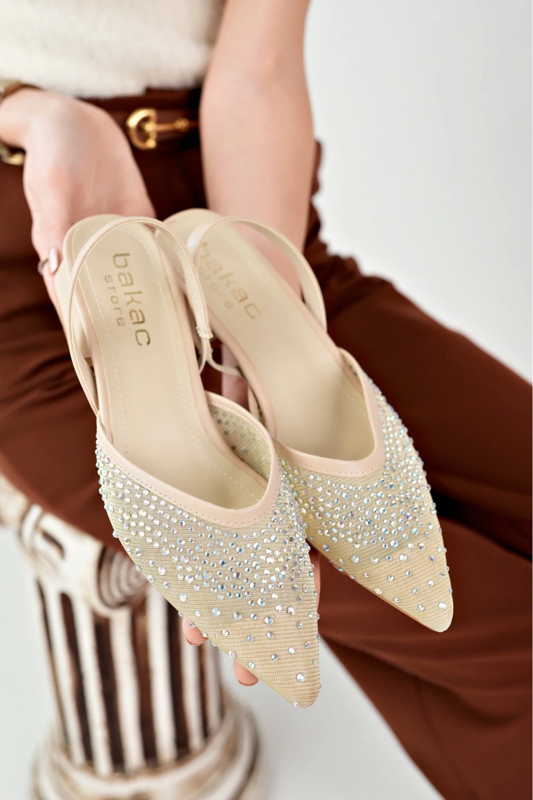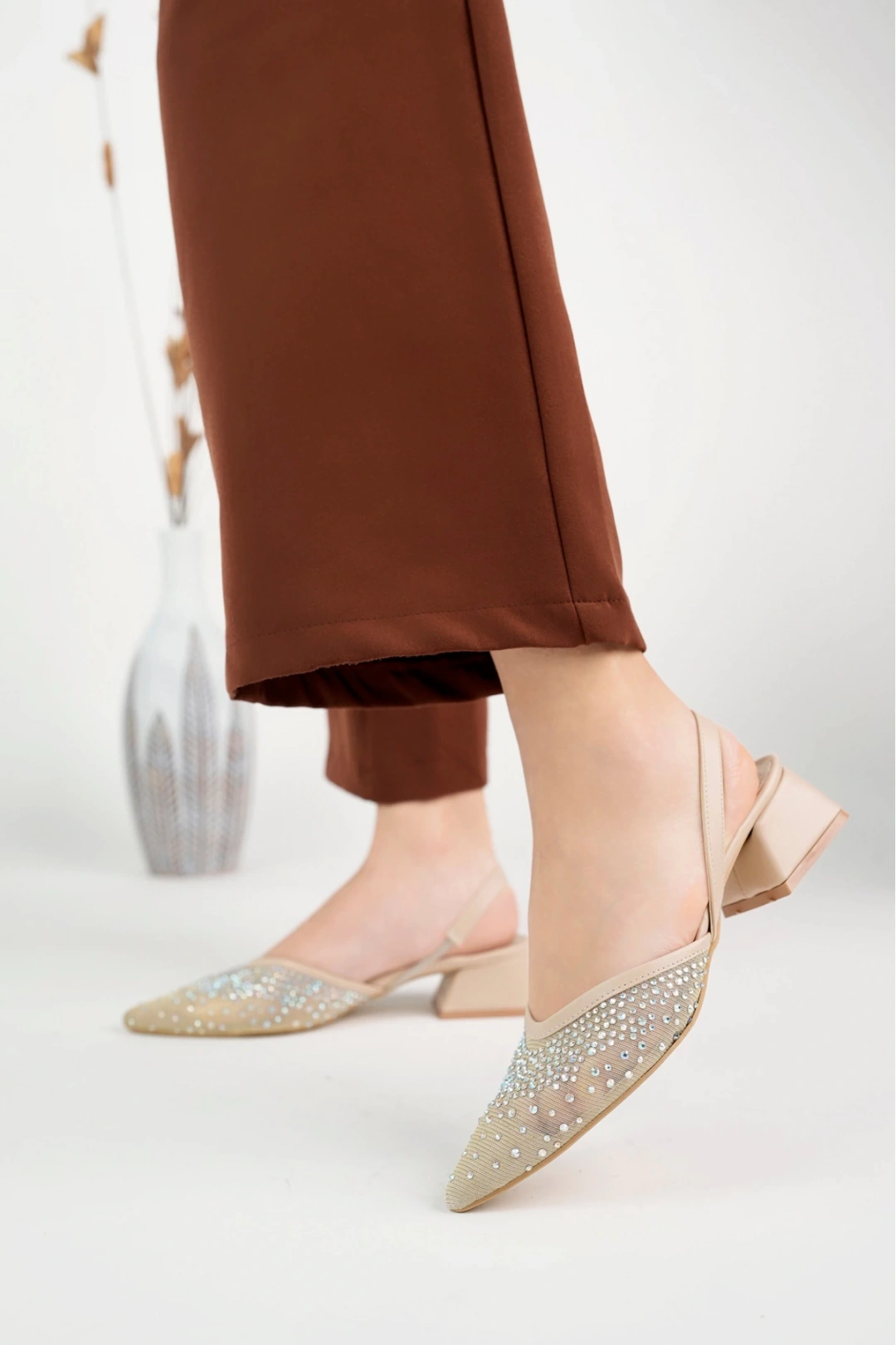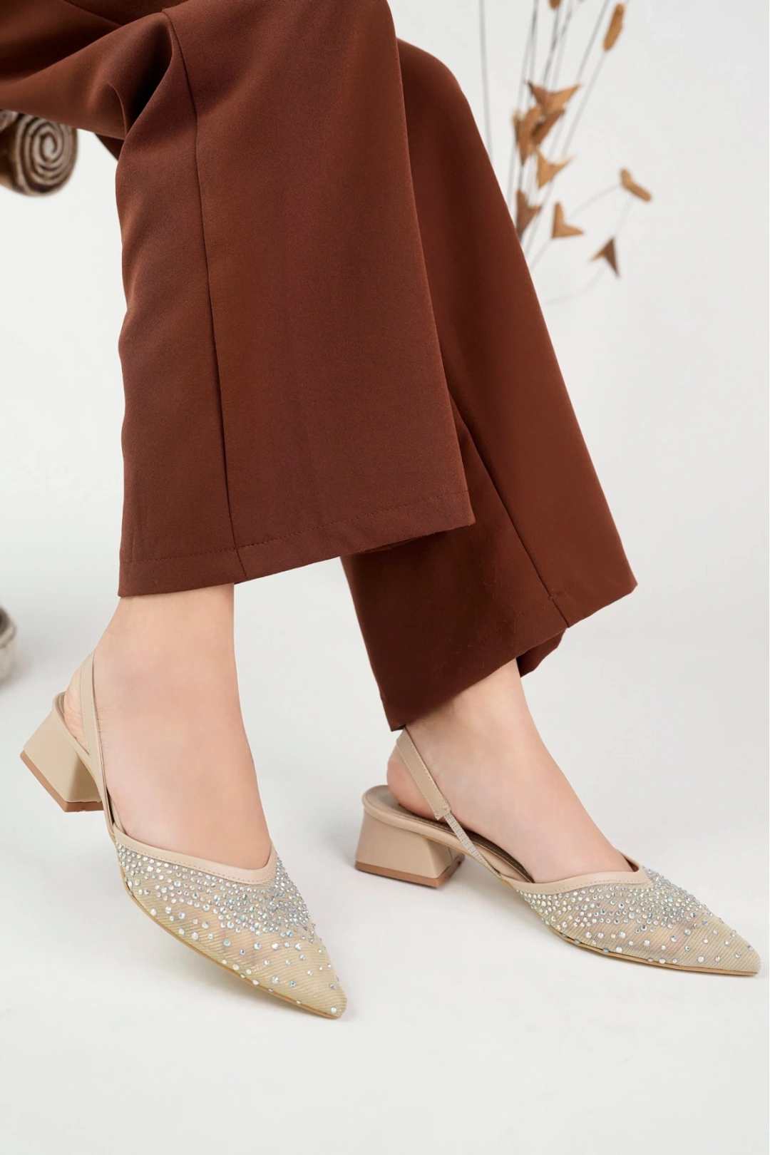 Kadın Bej Kısa Topuklu Taşlı Ayakkabı