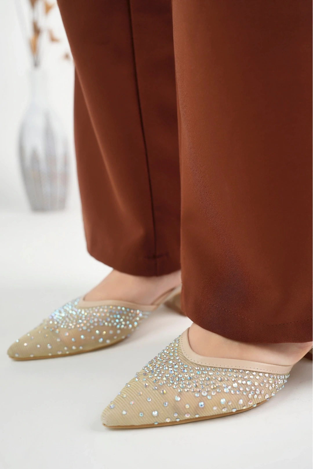 Kadın Bej Süet Taş Detaylı Sivri Burun Arkası Açık Ayakkabı