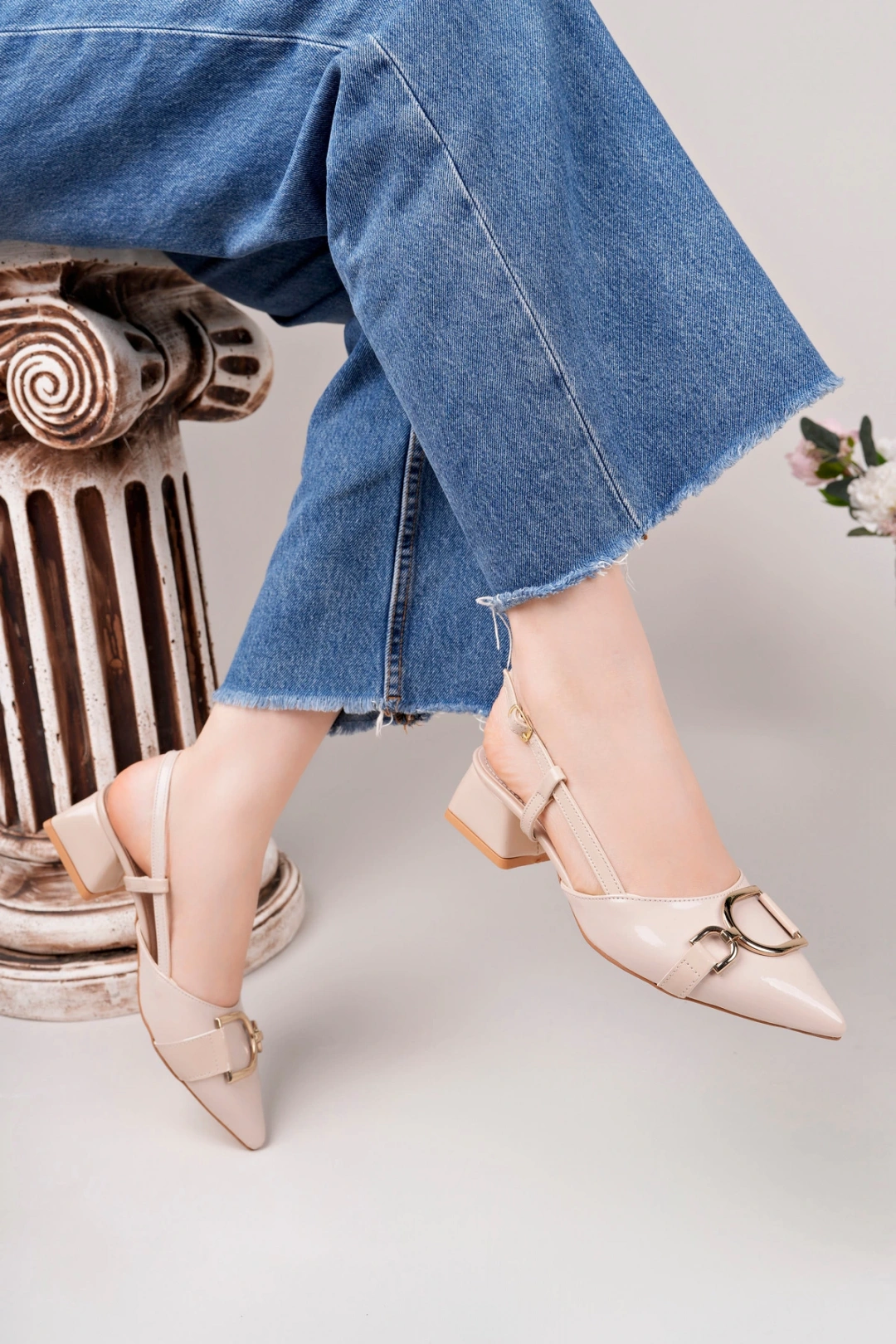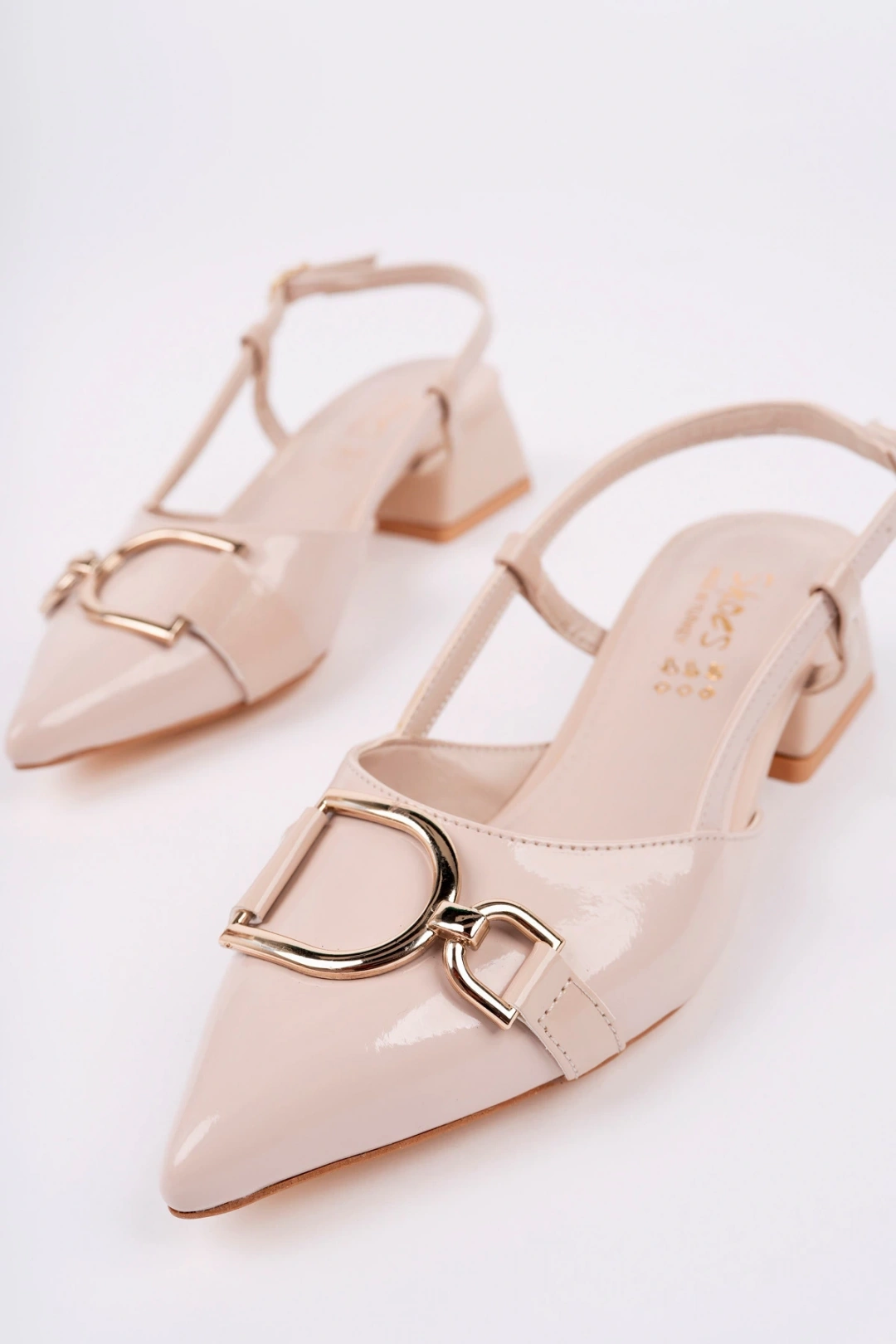 Kadın Bej Rugan Tokalı Sivri Burun Kısa Topuklu Ayakkabı