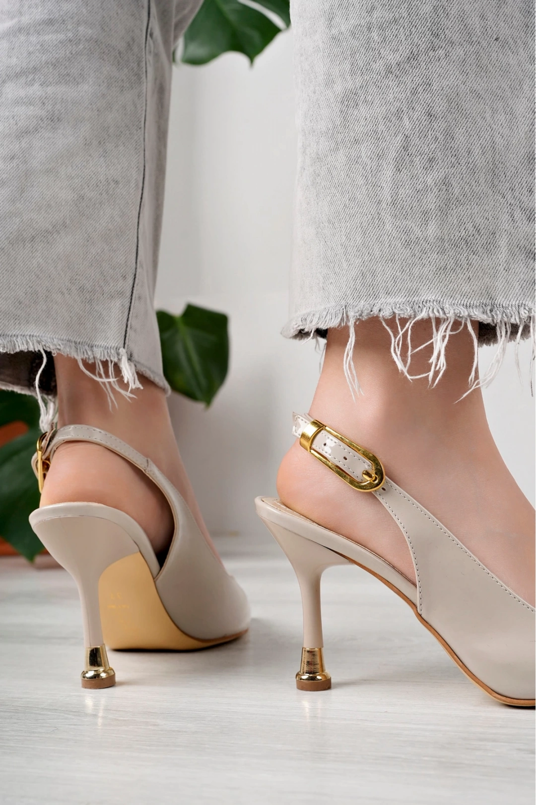 Kadın Bej Deri Tokalı Sivri Şık Topuklu Stiletto Ayakkabı