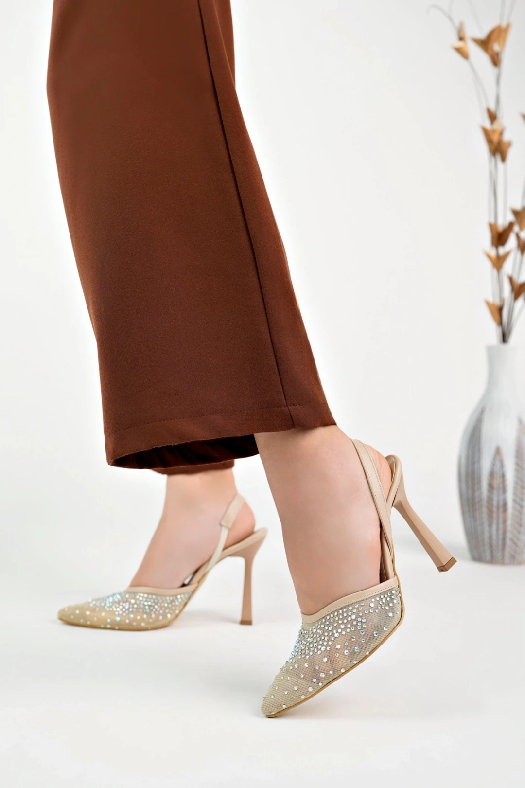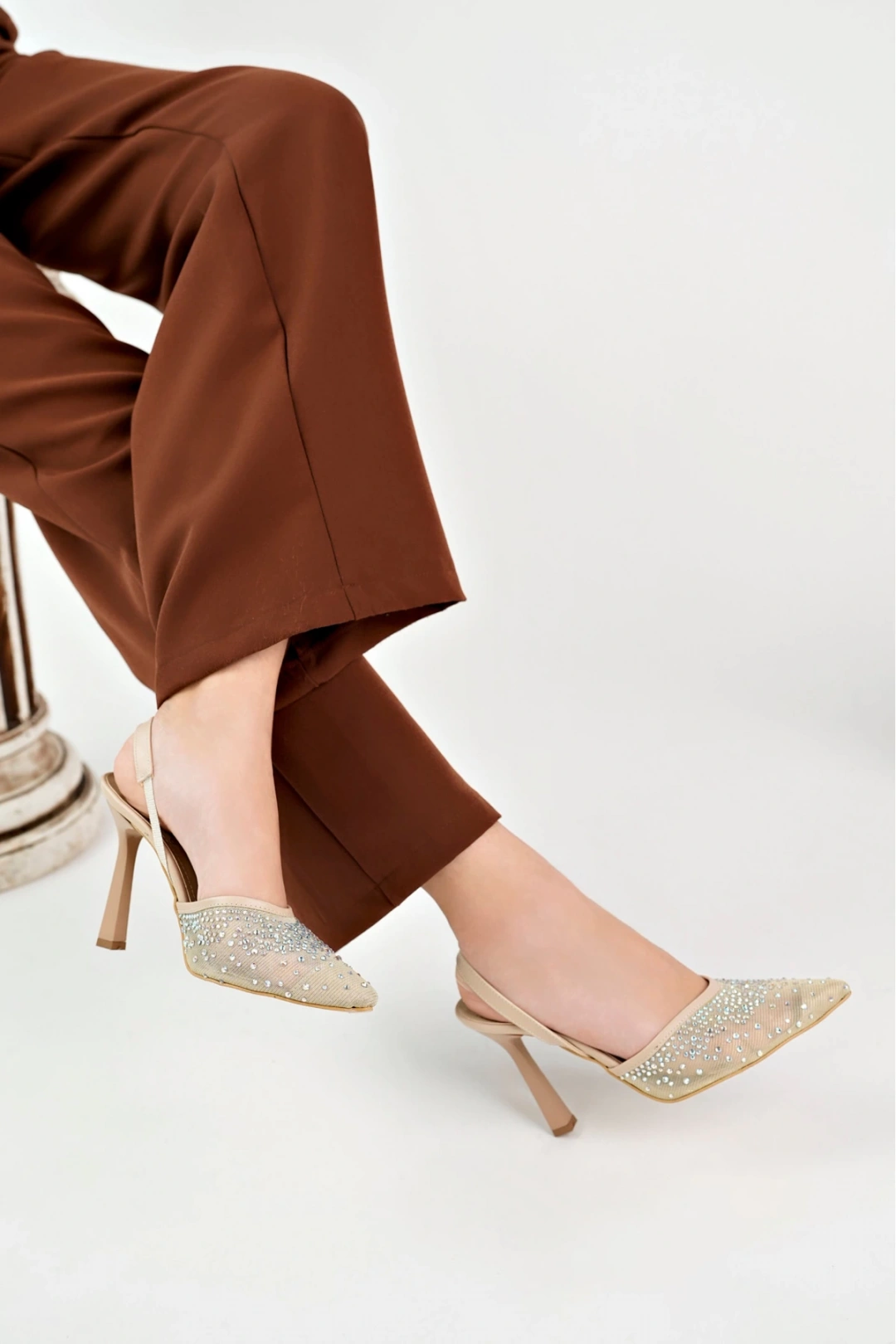 Kadın Bej Sivri Burun Taşlı Arkası Açık Abiye Yeni Sezon Topuklu Ayakkabı