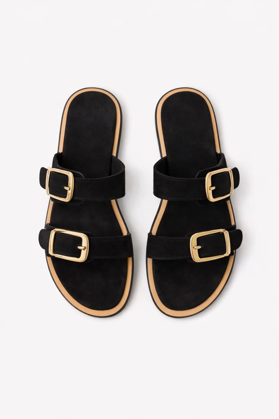 Kadın Siyah Süet Çift Biyeli Rahat Taban Terlik