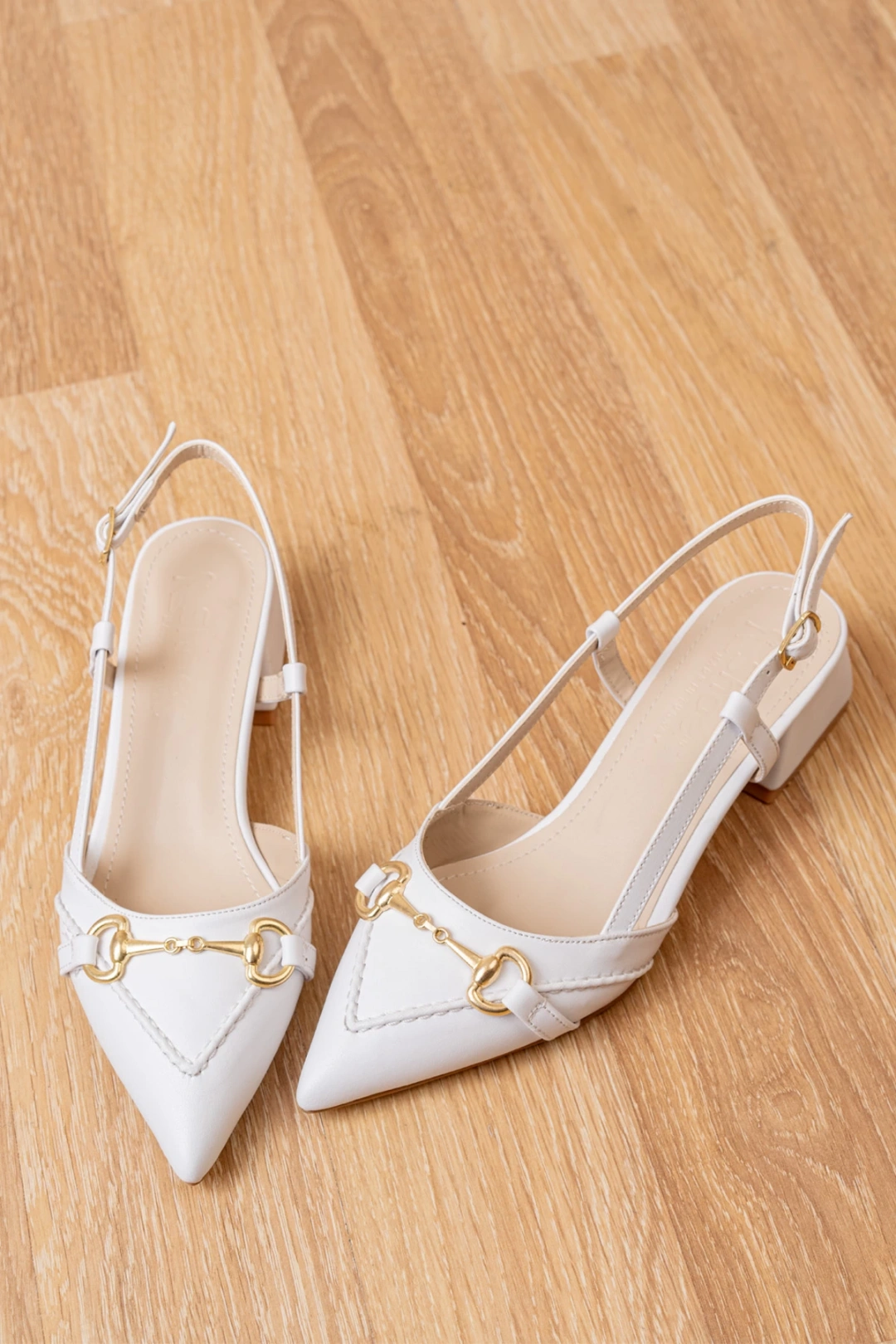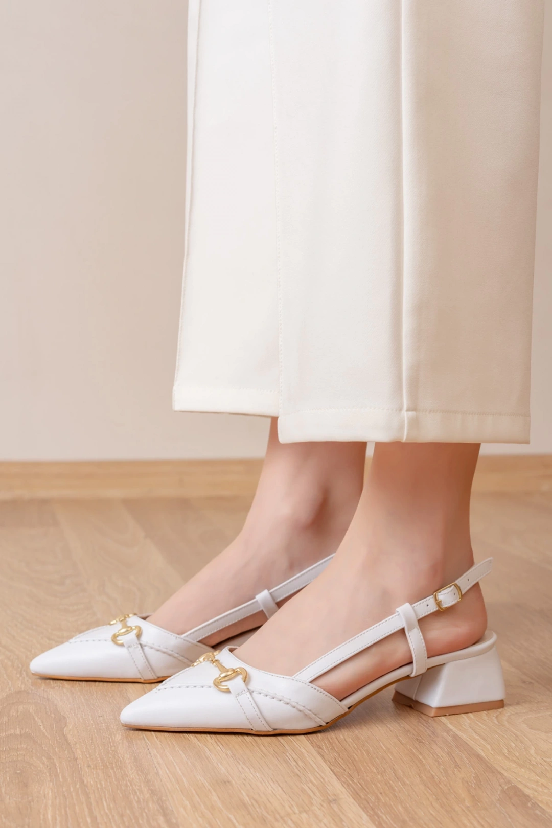 Kadın Beyaz Saraçlı Tokalı Sivri Burun Topuklu Ayakkabı