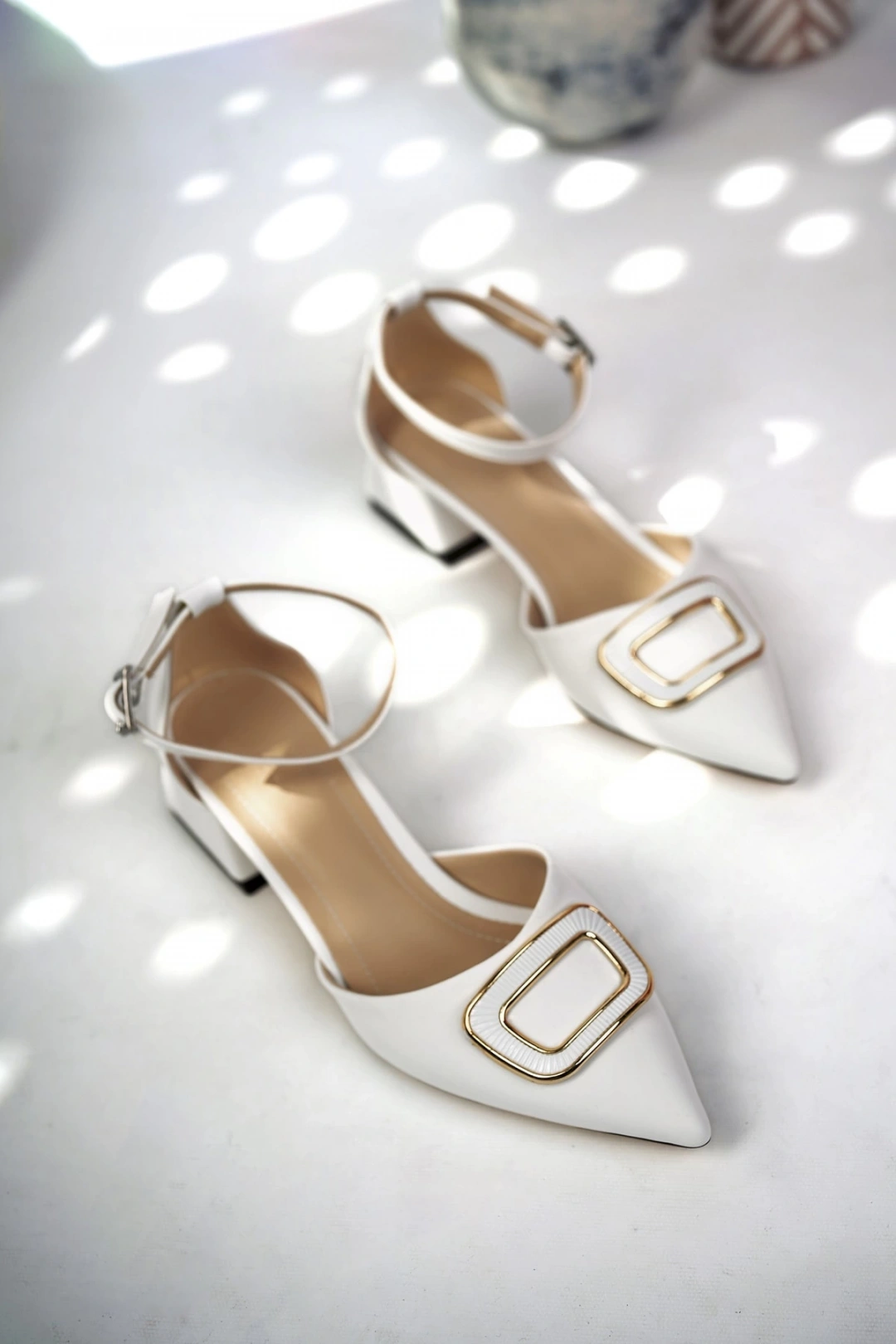 Kadın Beyaz Deri Tokalı Sivri Şık Topuklu Stiletto Ayakkabı