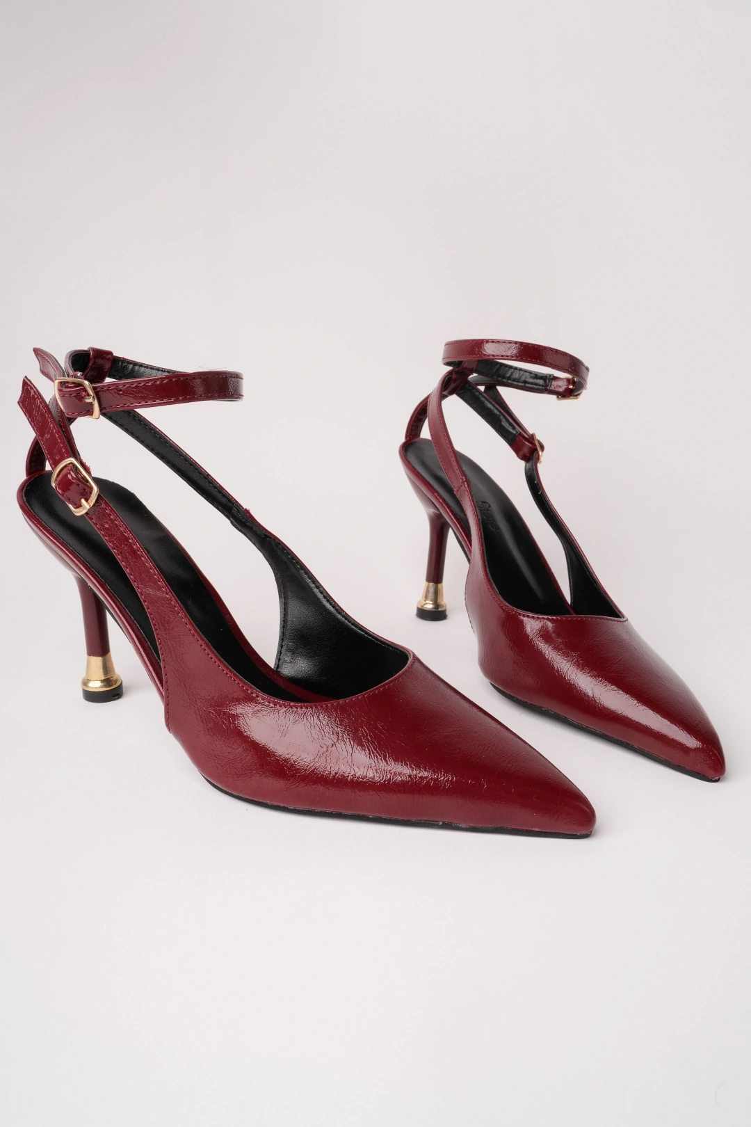 Kadın Bordo Kırışık Rugan Önü Açık Tek Bantlı Topuklu Ayakkabı