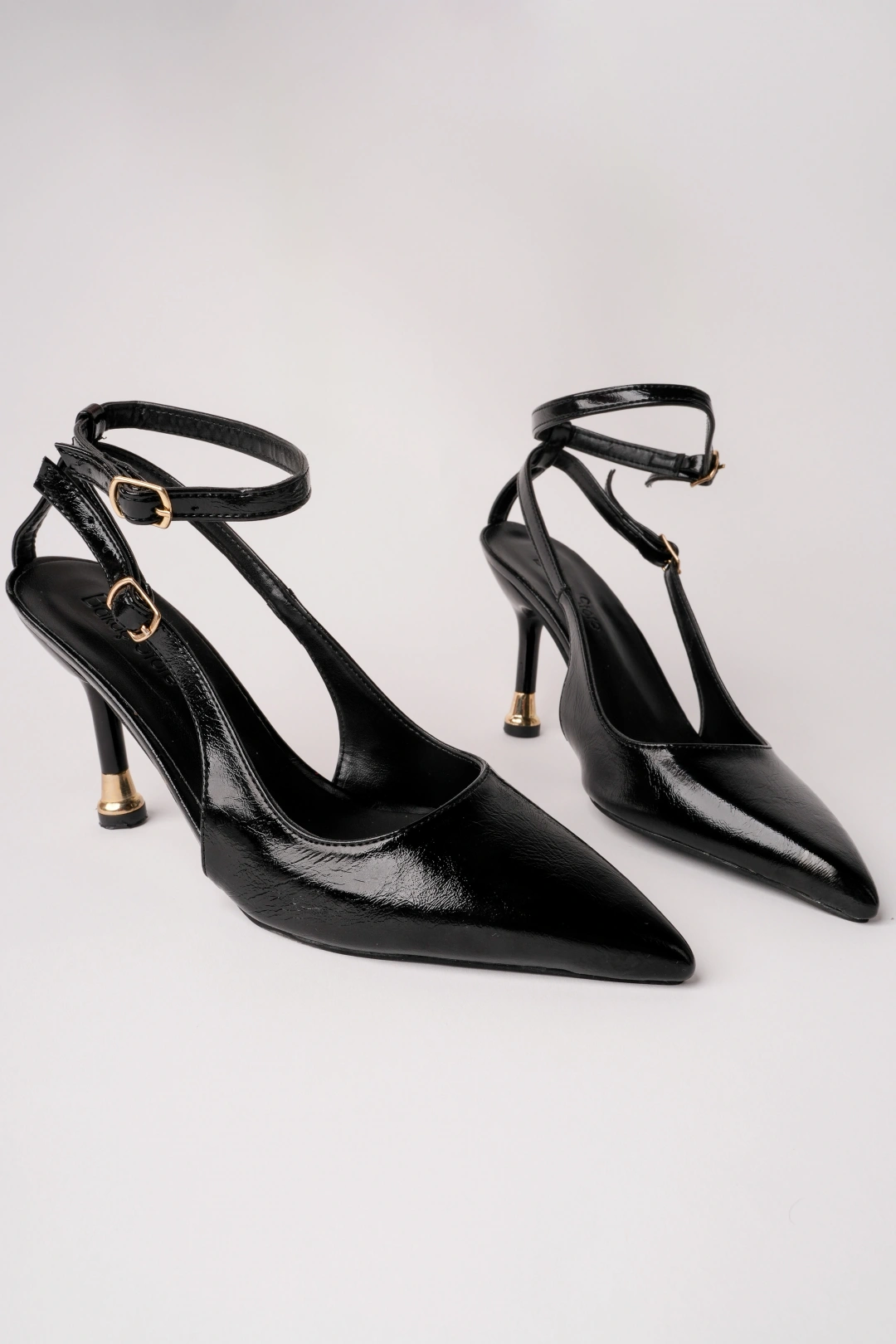 Siyah Rugan Sivri Burun Şık Topuklu Ayakkabı