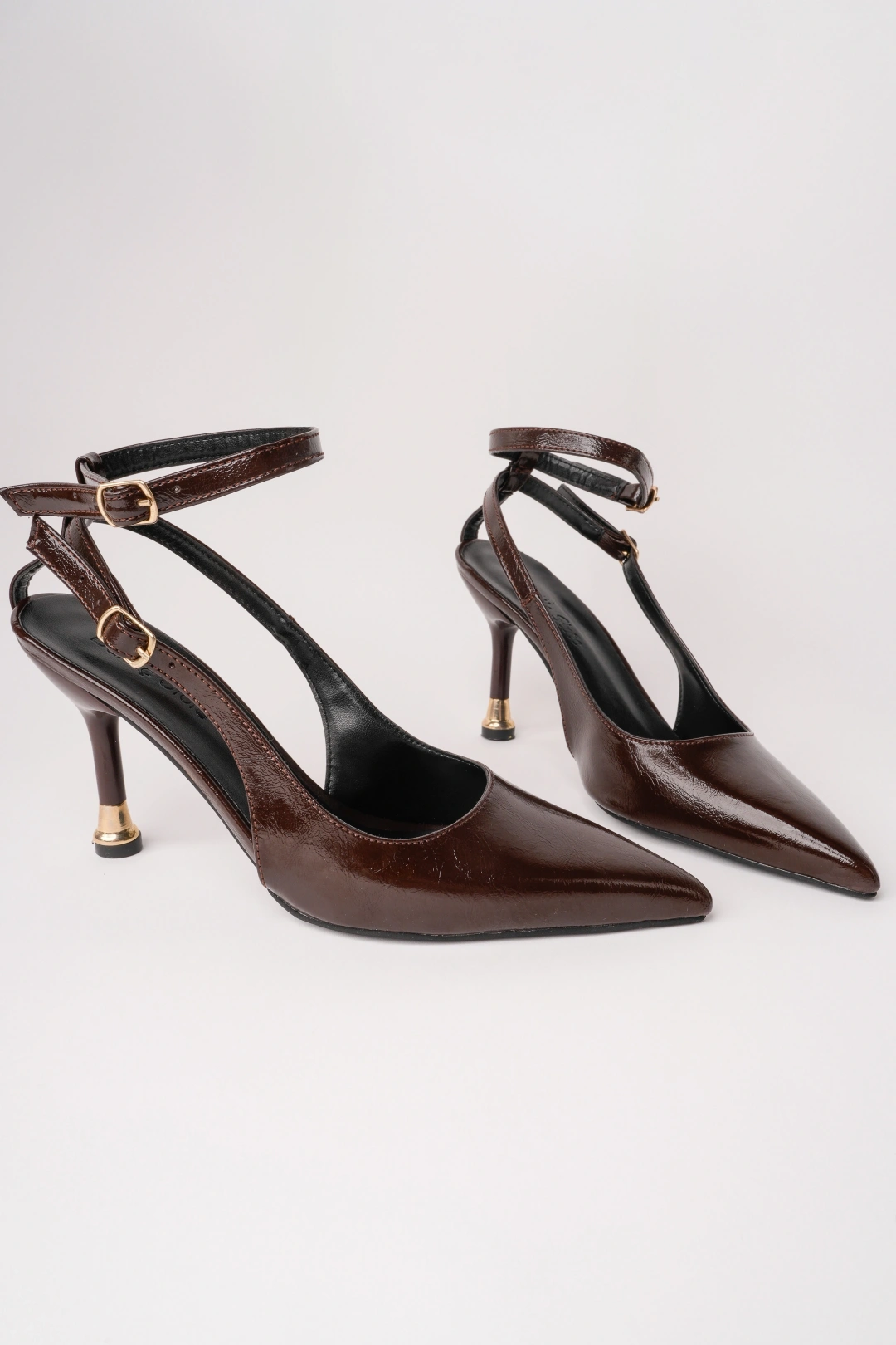 Kadın Kahverengi Kırışık Rugan Çift Biyeli Topuklu Ayakkabı