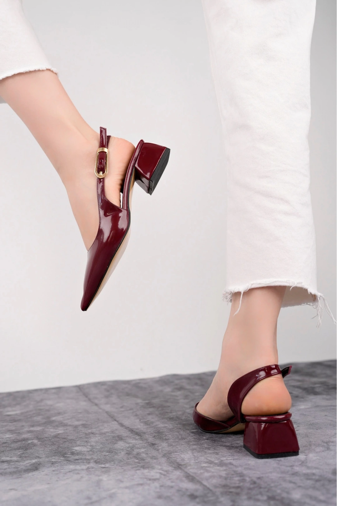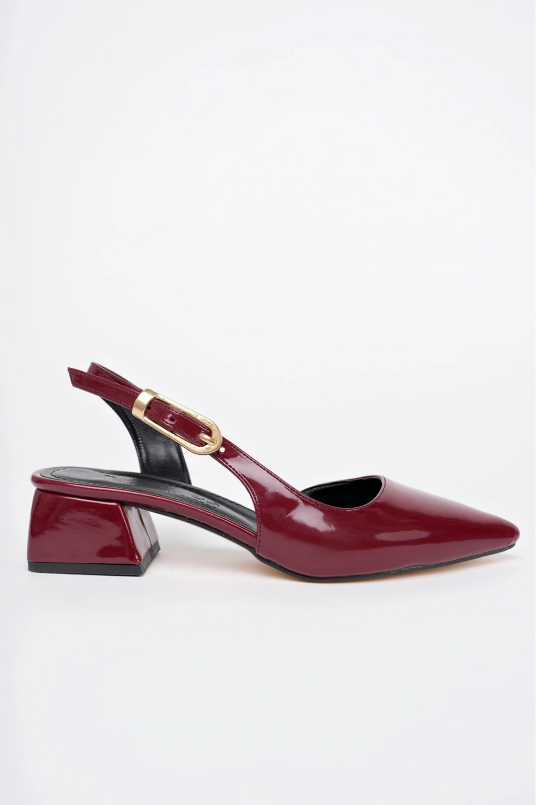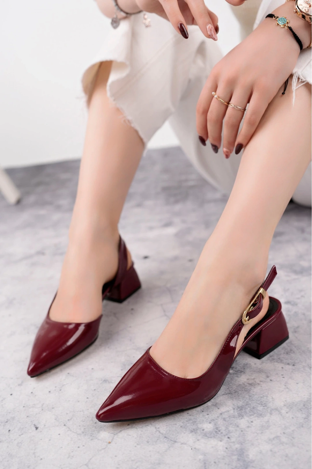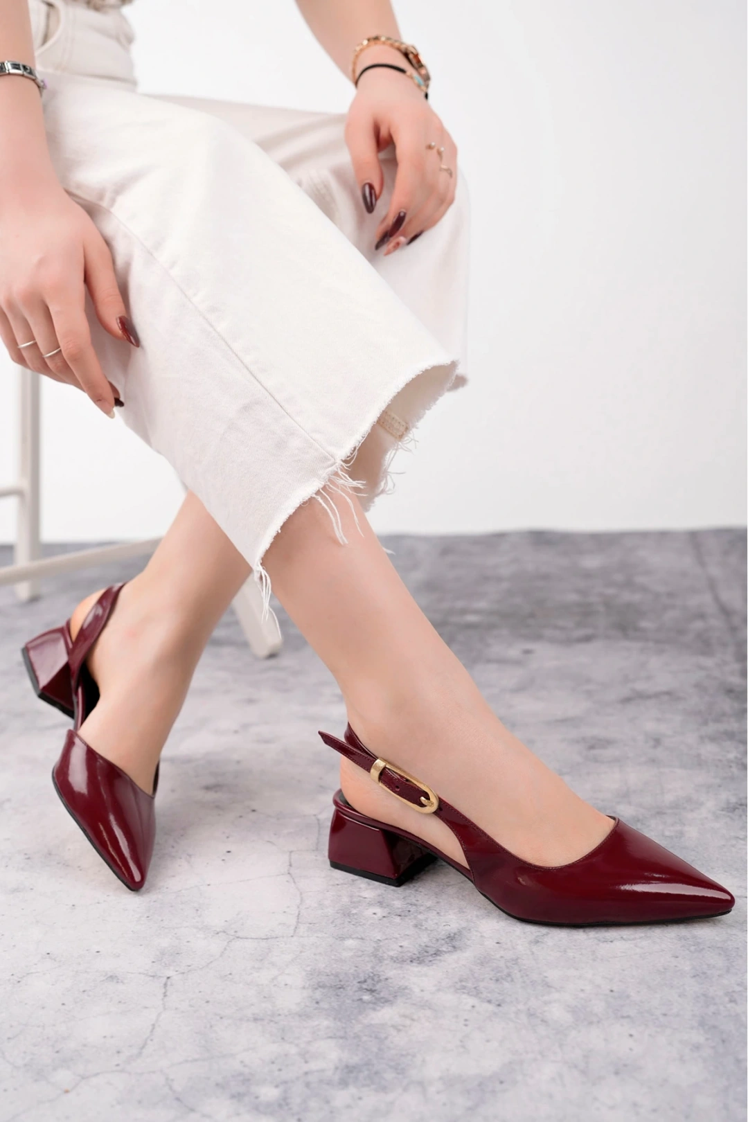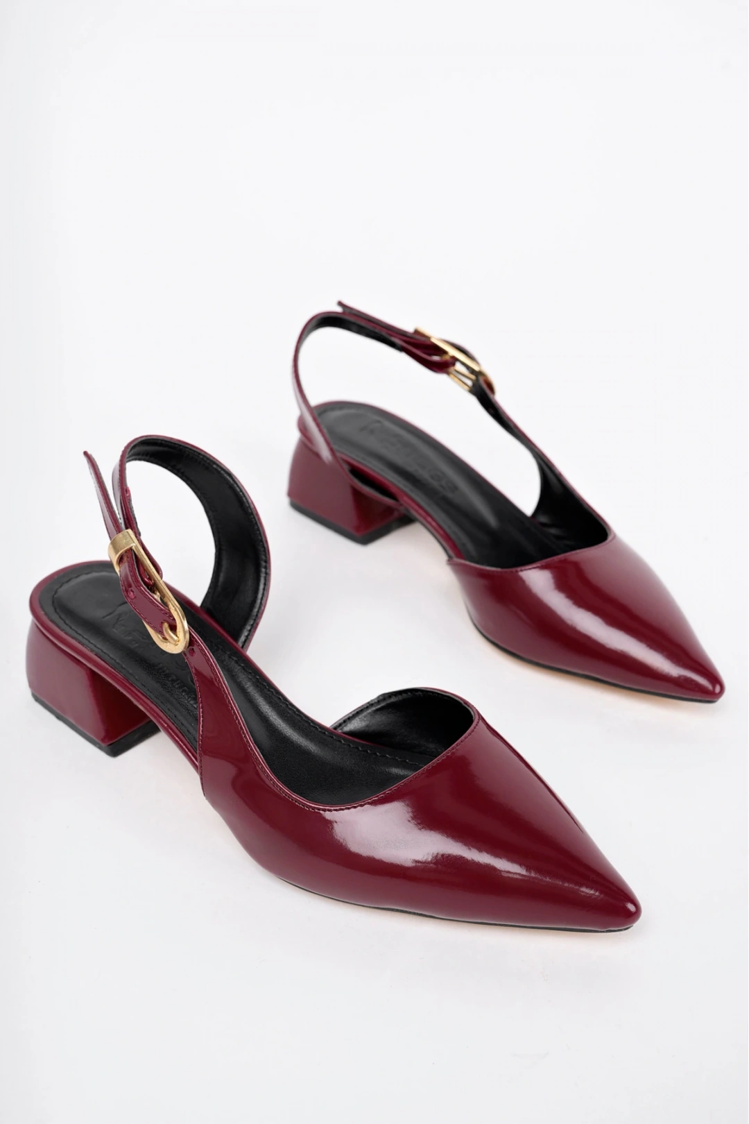 Kadın Bordo Rugan Tokalı Sivri Burun Kısa Topuklu Ayakkabı
