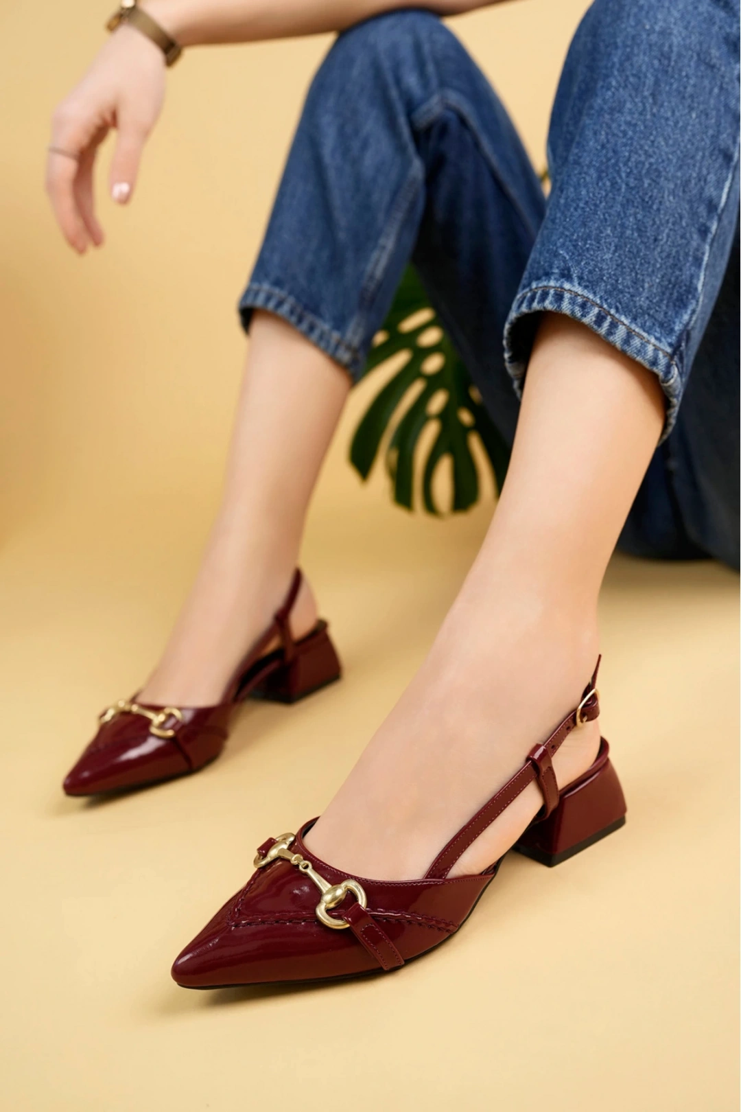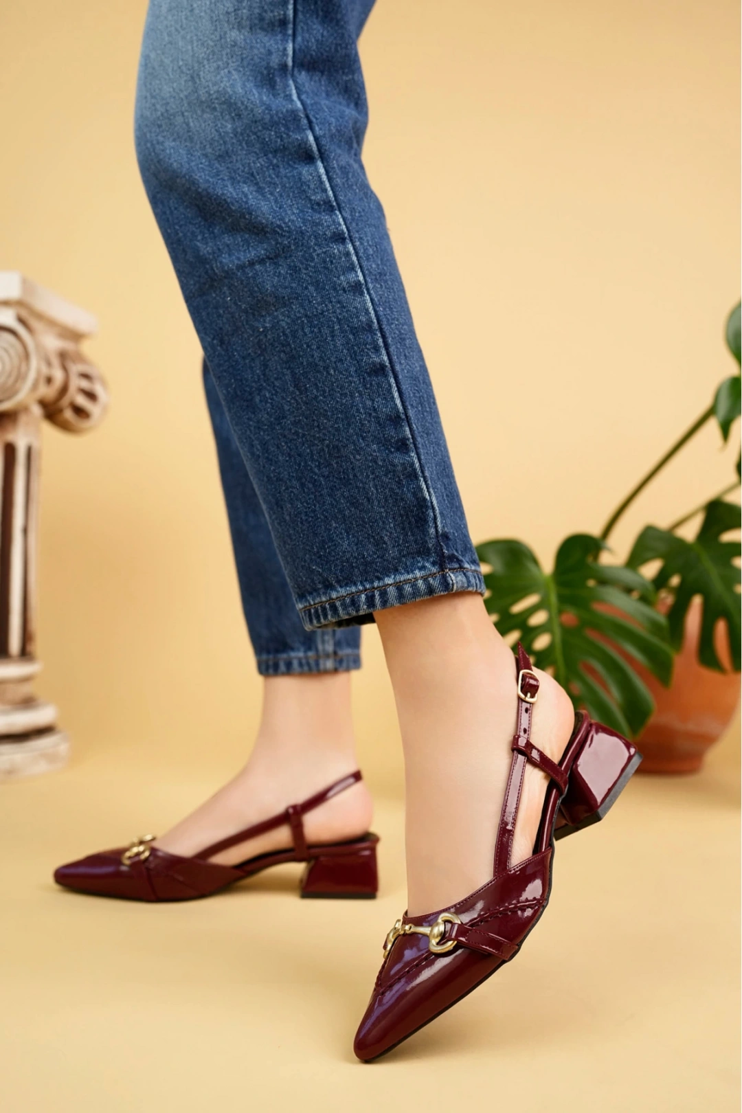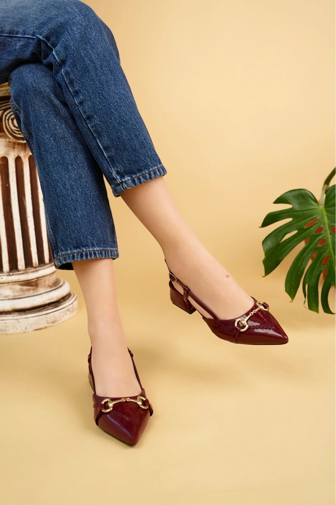 Kadın Bordo Rugan Tokalı Sivri Burun Kısa Topuklu Ayakkabı