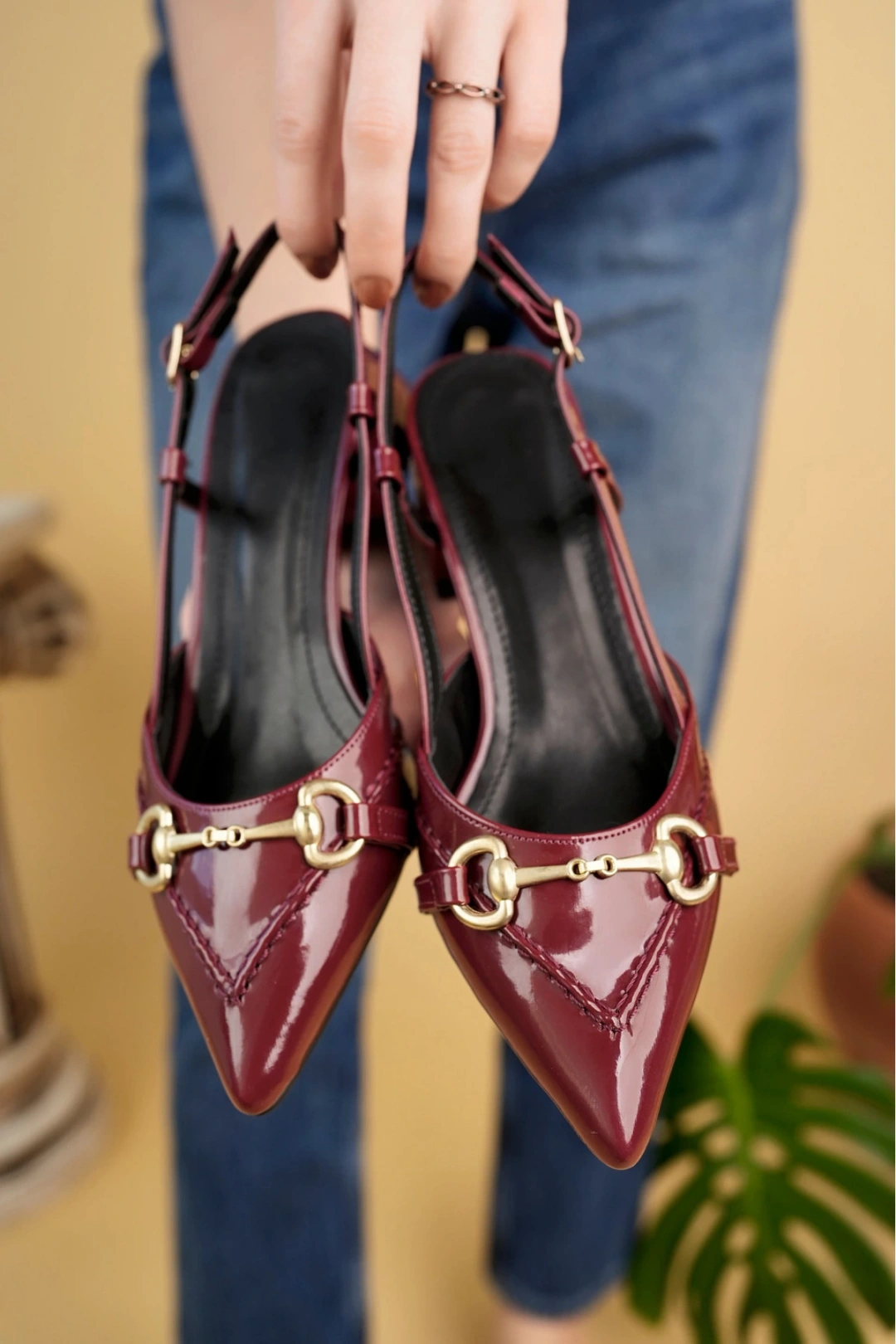 Kadın Bordo Rugan Saraçlı Tokalı Sivri Burun Topuklu Ayakkabı