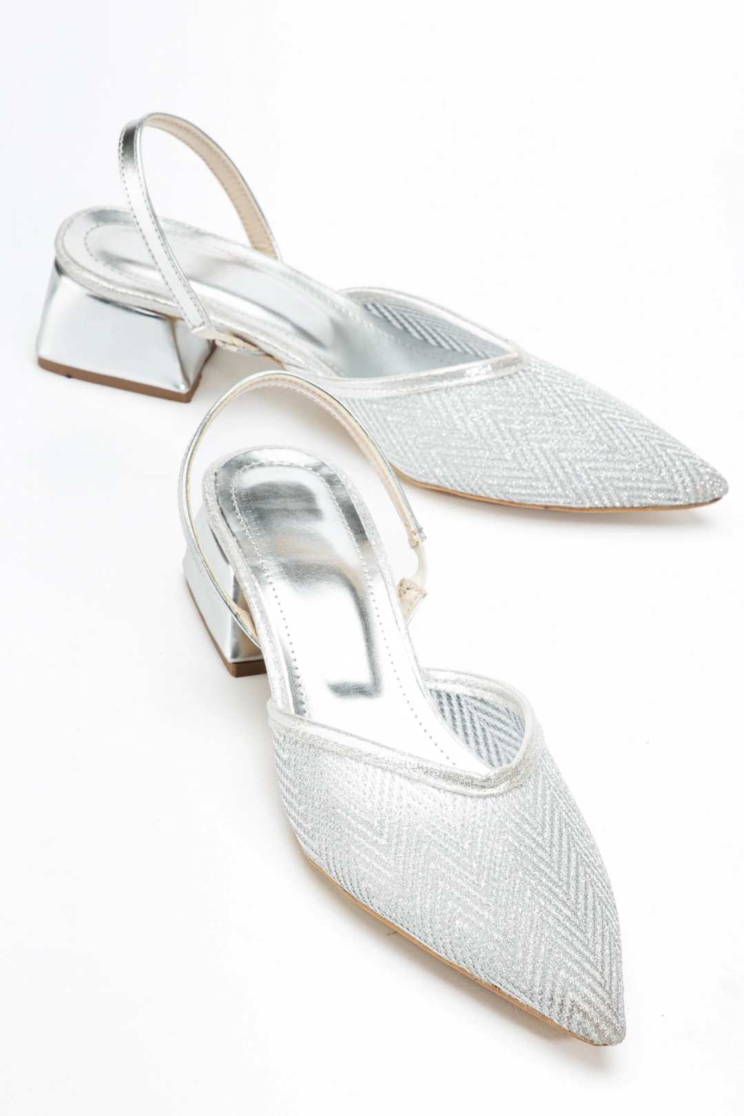 Kadın Gümüş Rengi Parlak Şeffaf Kumaş Kısa Topuklu Ayakkabı