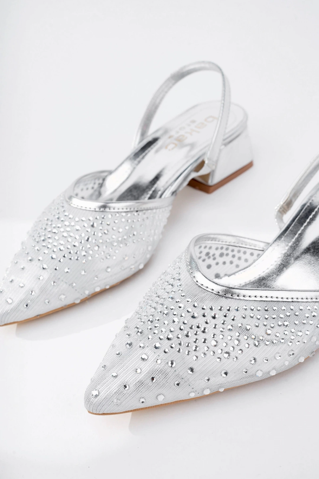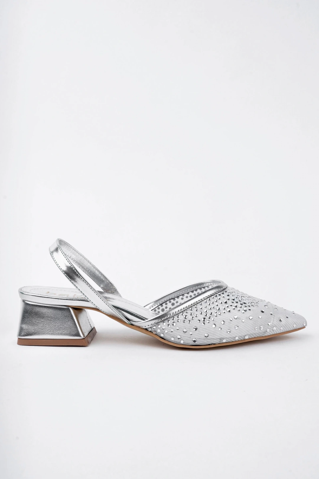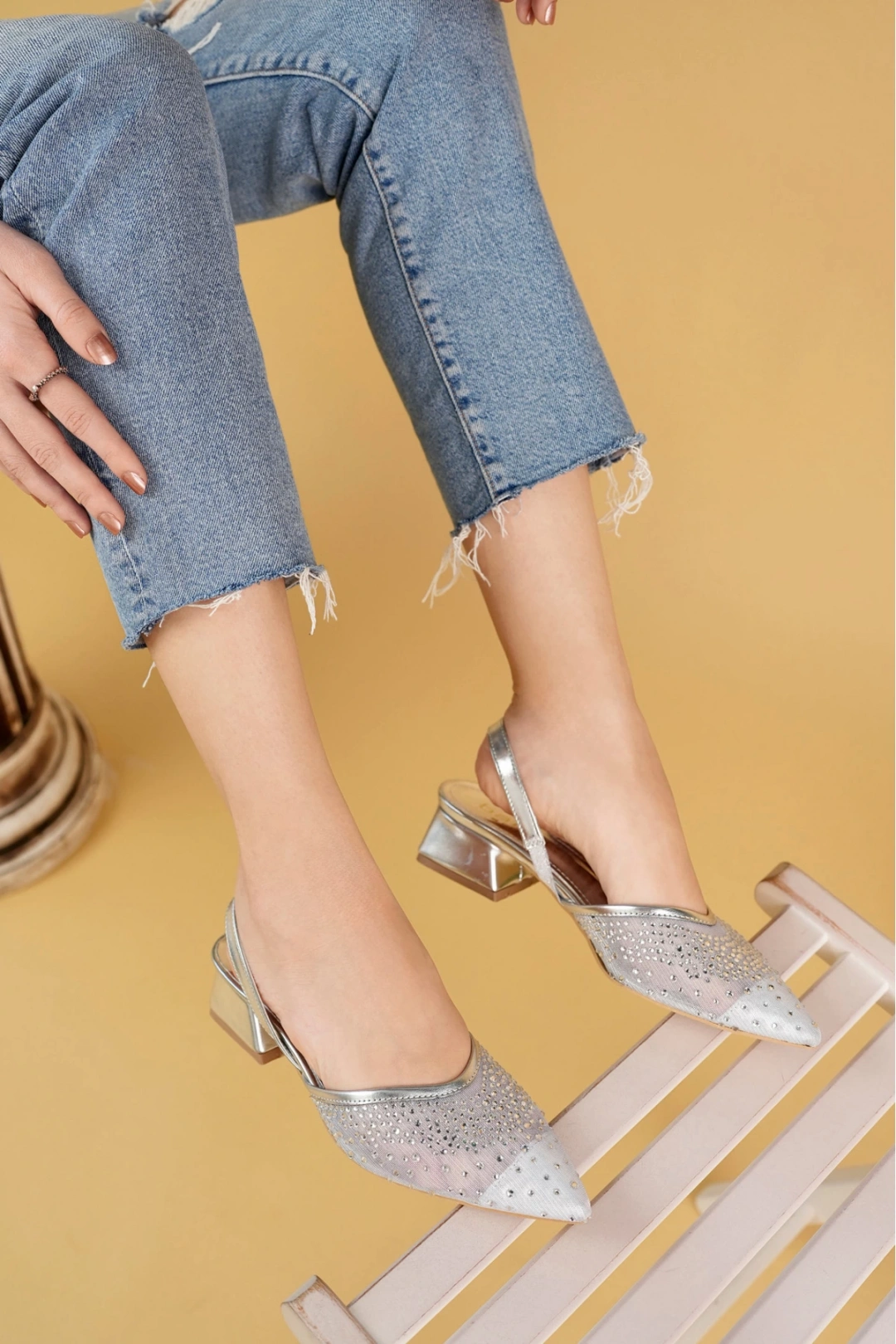 Kadın Gümüş Kısa Topuklu Taşlı Ayakkabı