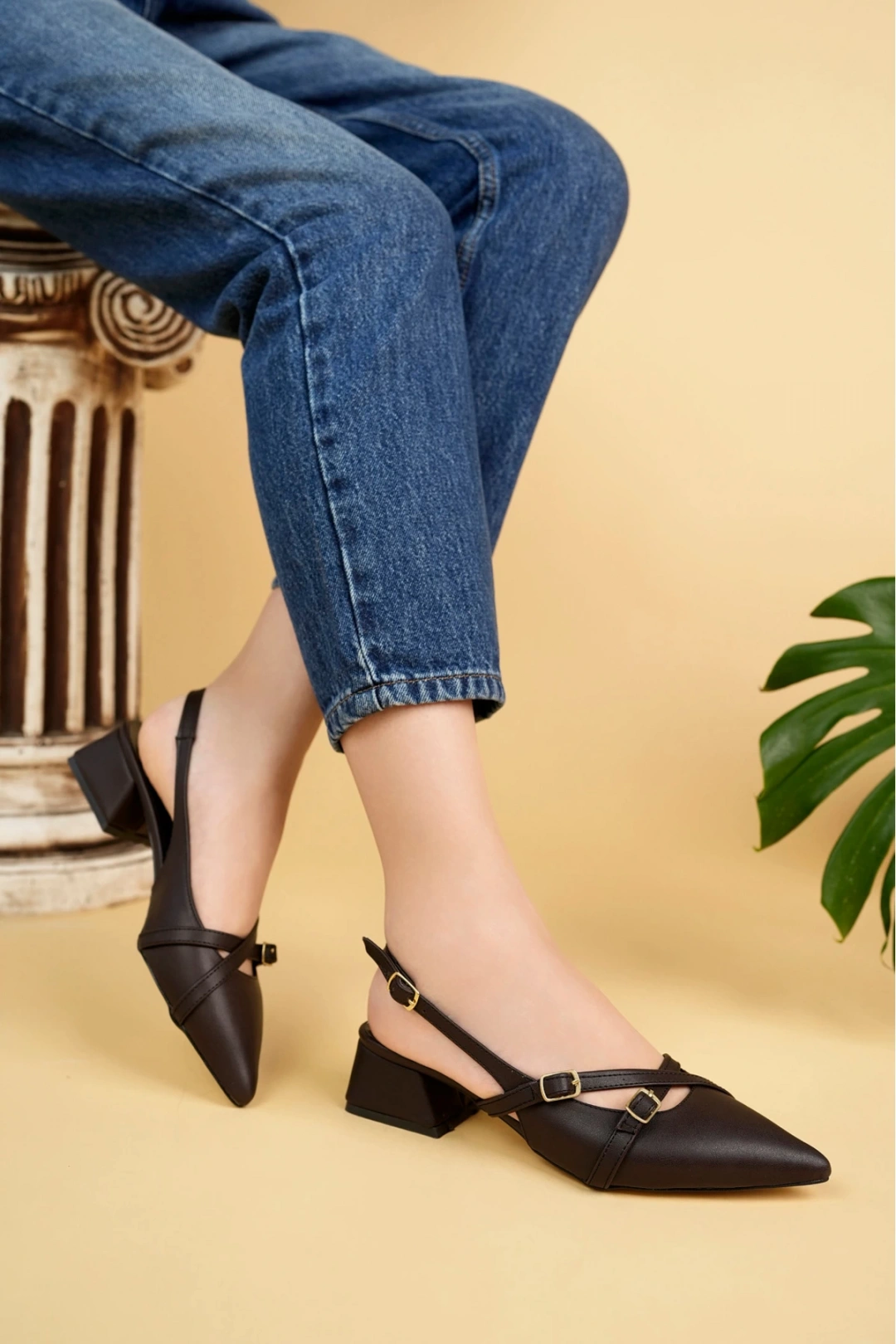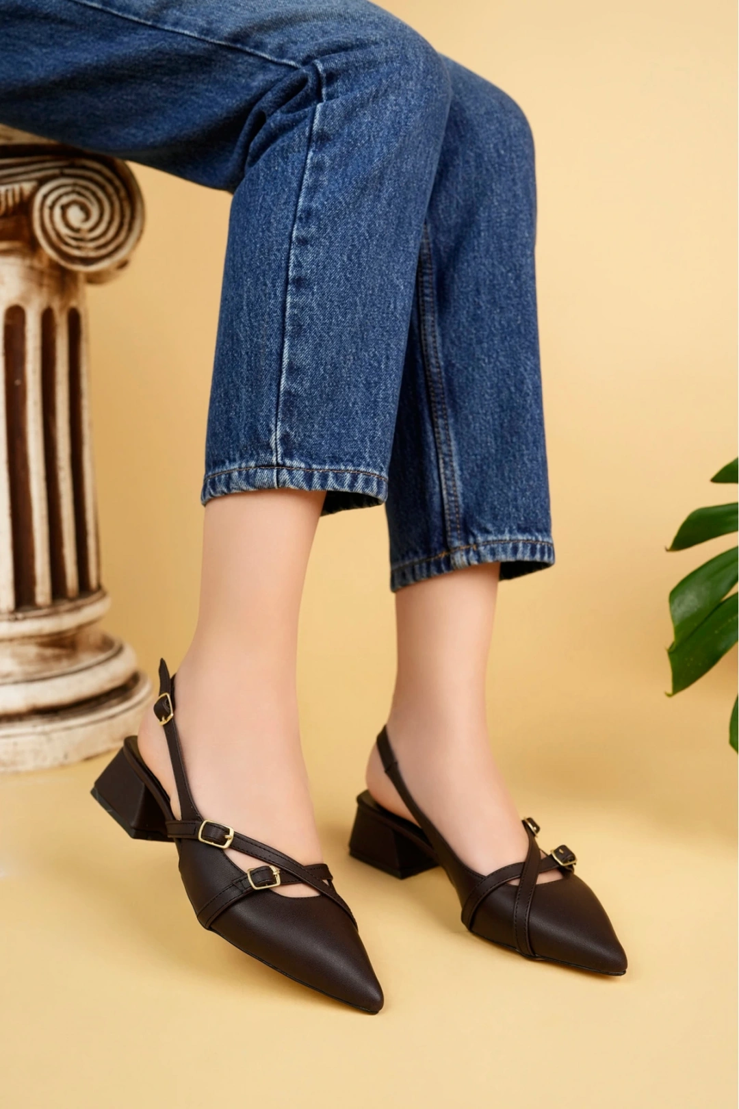 Kadın Siyah Deri Tokalı Sivri Şık Topuklu Stiletto Ayakkabı