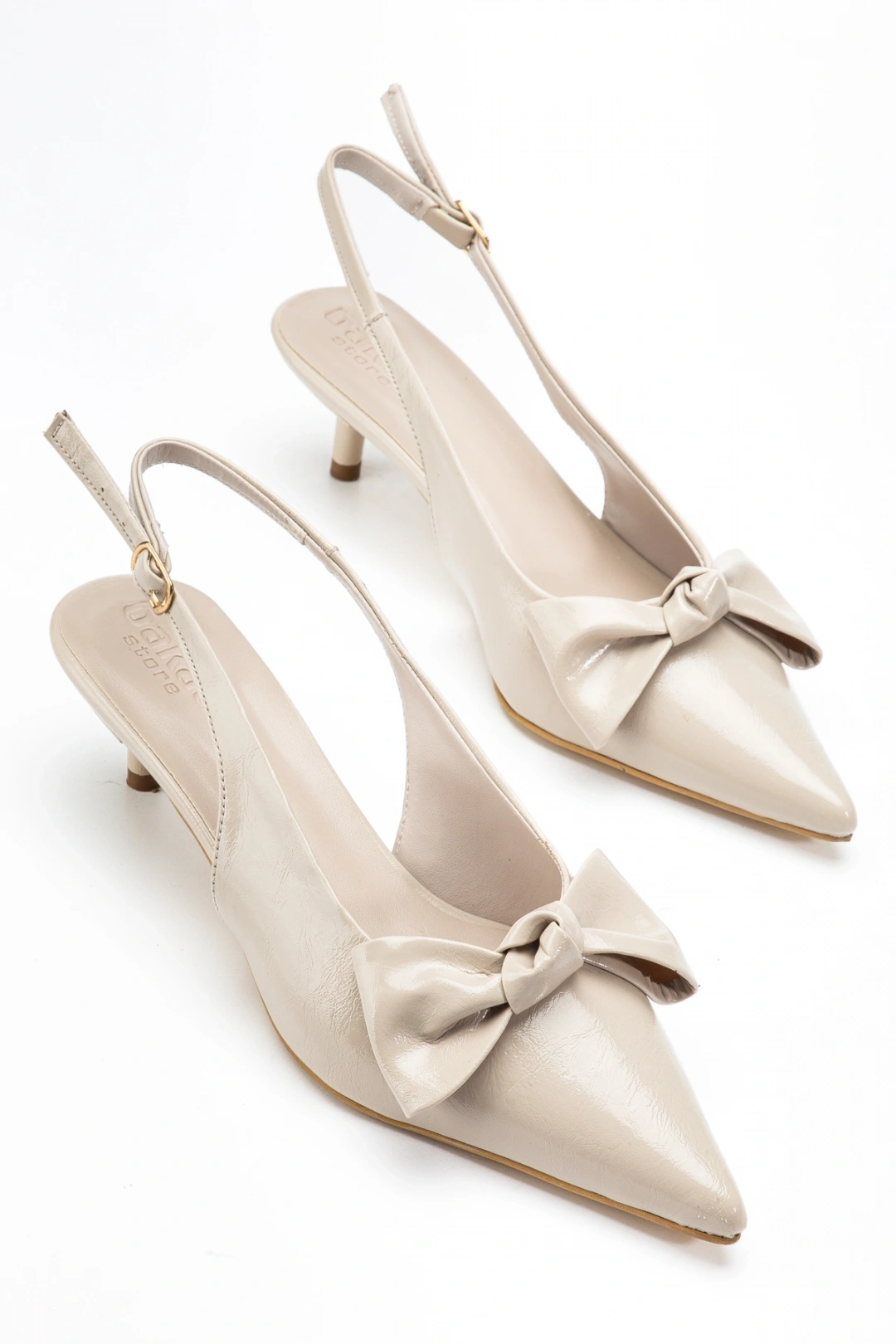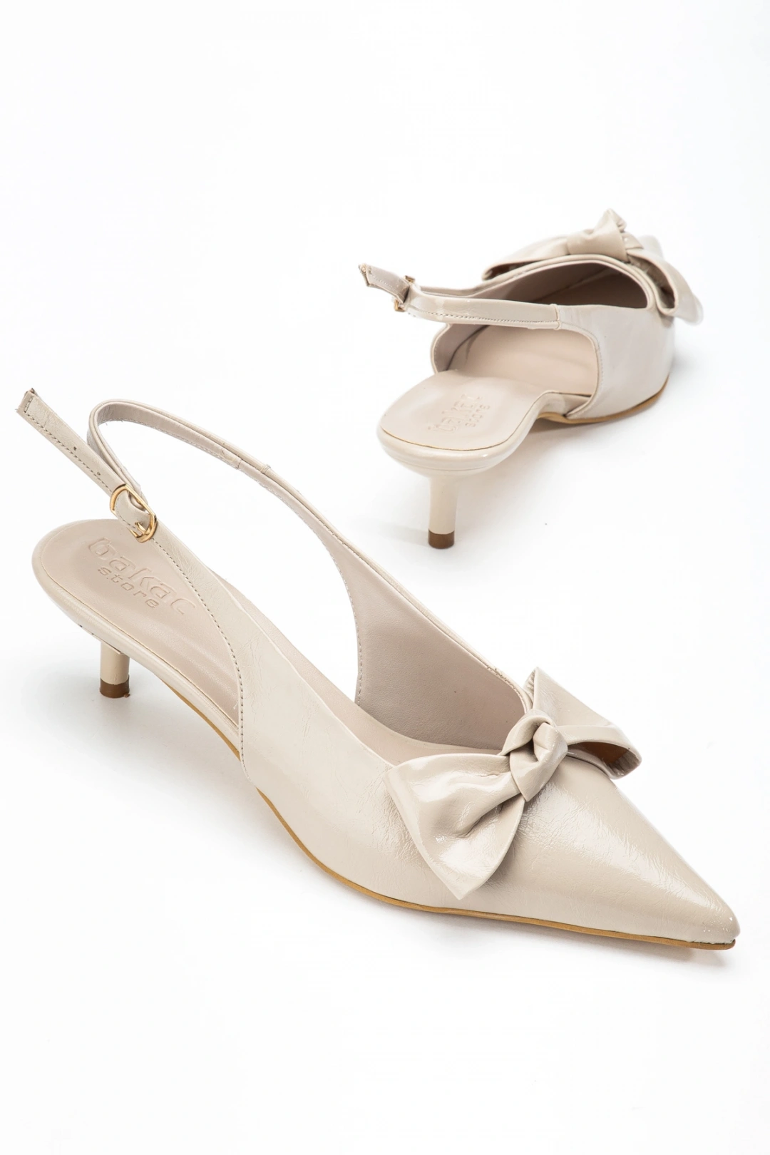 Kadın Bej Kırışık Rugan Çift Biyeli Topuklu Ayakkabı