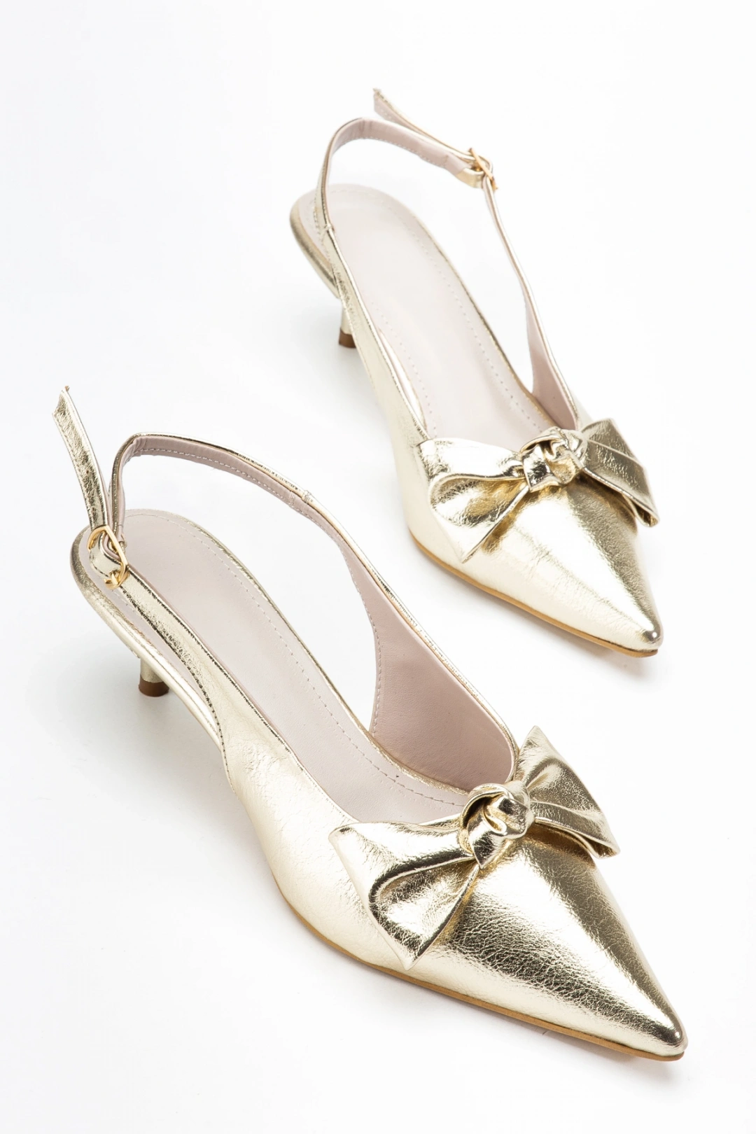 Kadın Gold Rengi Kırışık Rugan Fiyonklu Kısa topuklu Ayakkabı