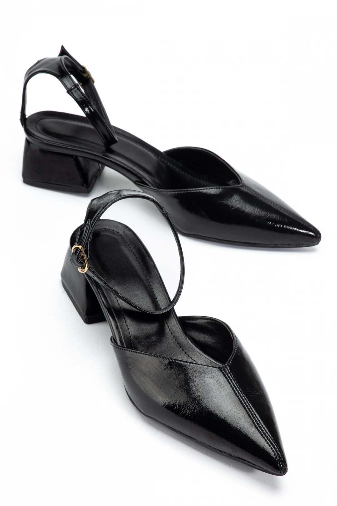 Kadın Siyah Kırışık Rugan Önü Dikişli Sivri Burun Kısa Topuklu Ayakkabı