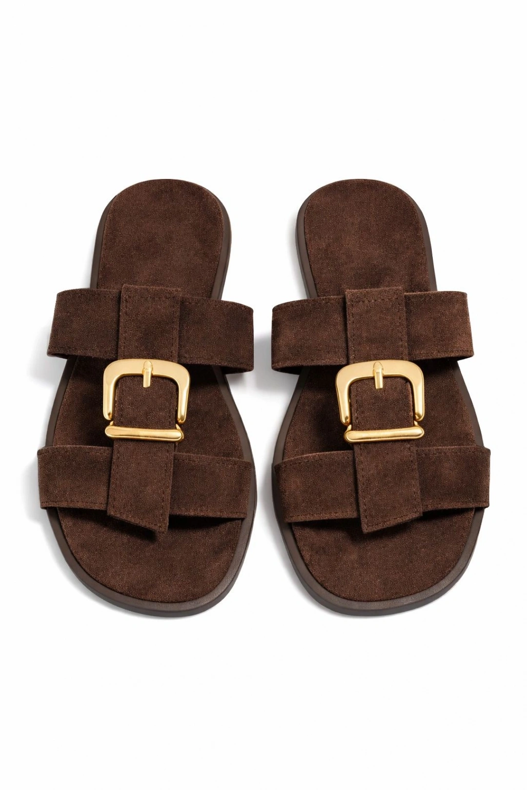 Kadın Kahverengi Süet Kumaş Gold Toka Detaylı Rahat Taban Terlik