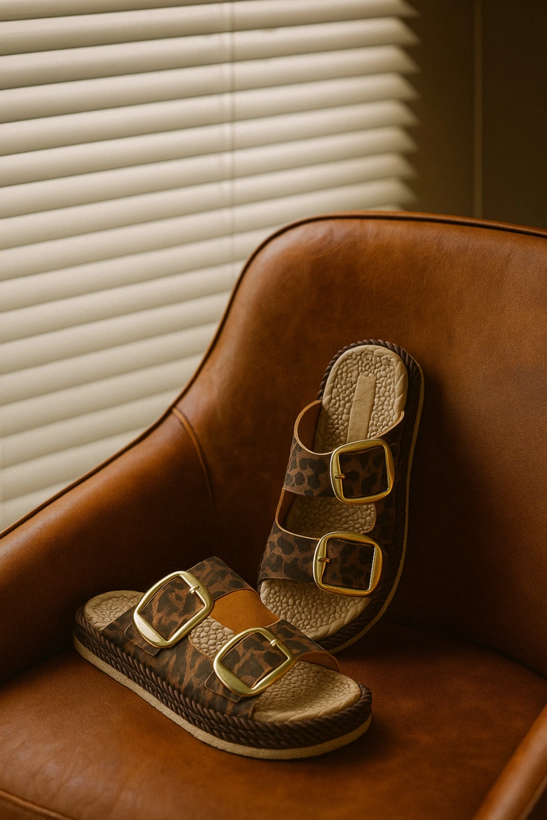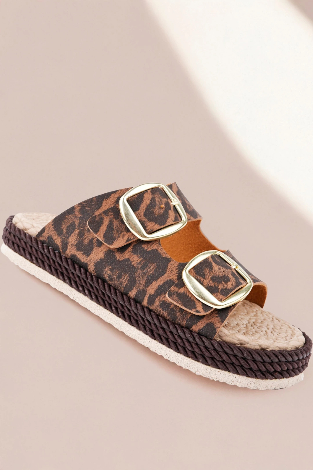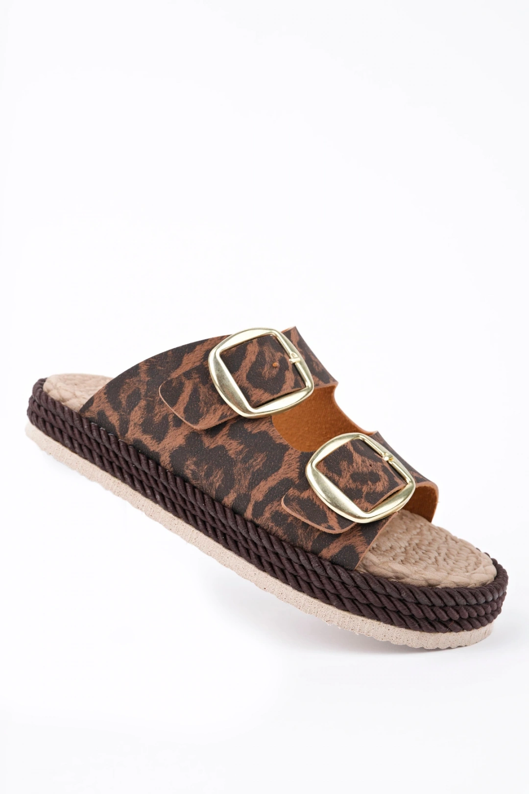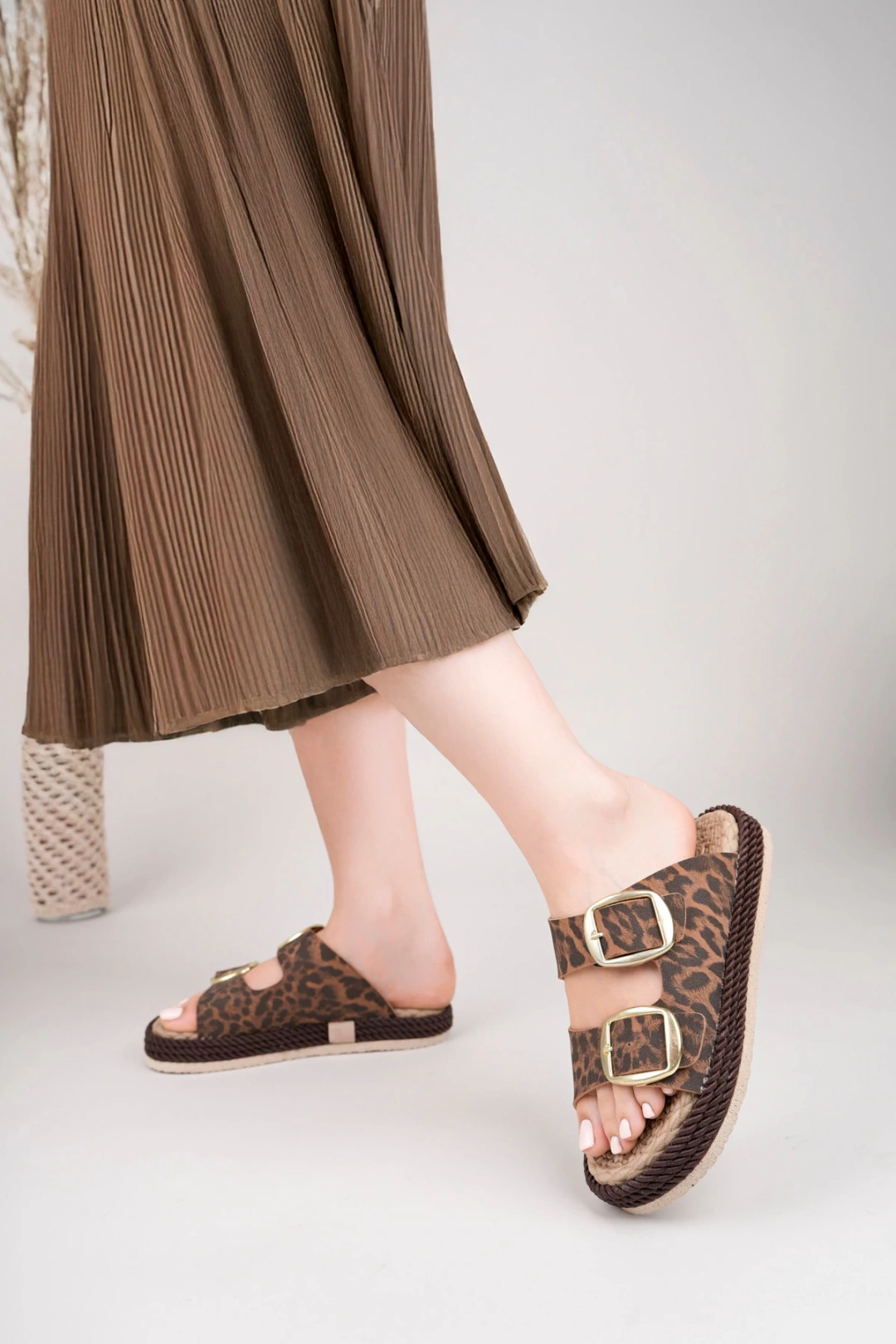 Kadın Leopar Desenli Günlük Çift Tokalı Rahat Taban Hasır Sandalet Terlik
