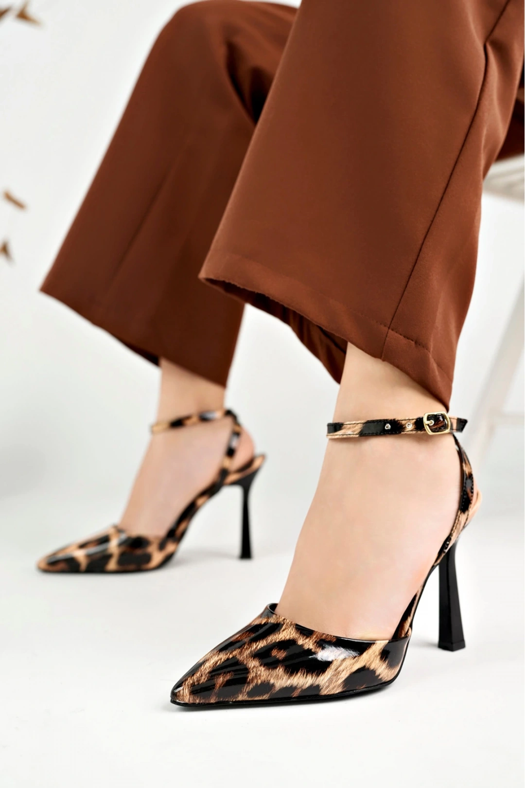 Kadın Leopar Desenli Rugan Arkası Bantlı Topuklu Ayakkabı