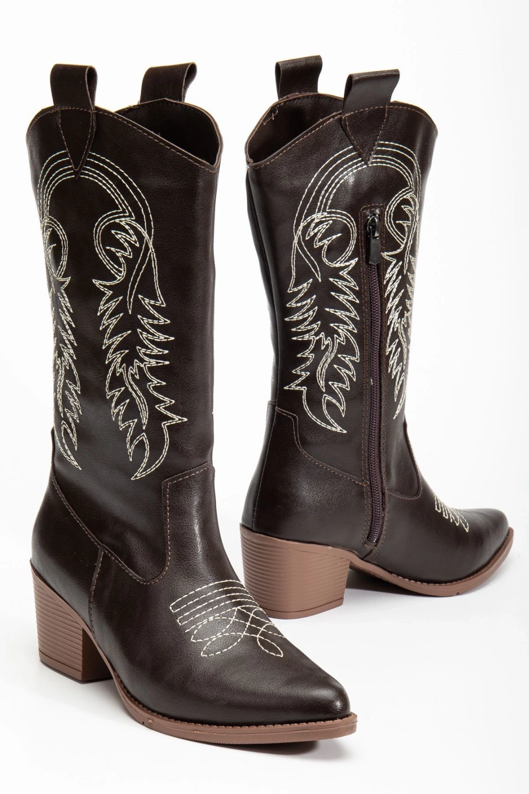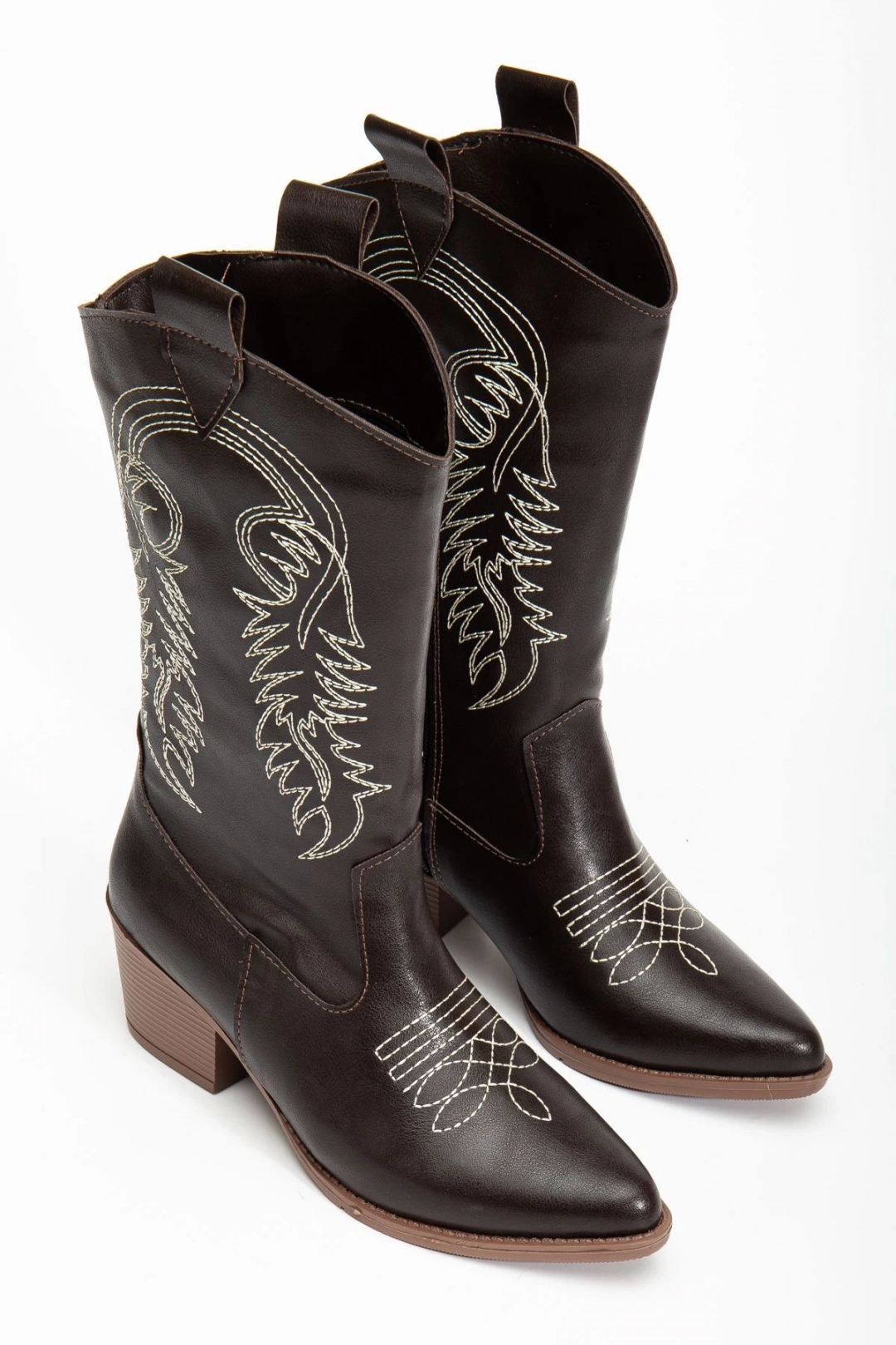 Kadın Nakışlı Yeni Sezon Kovboy Çizme Acı Kahverengi