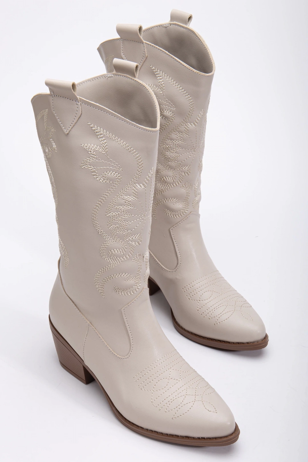 Kadın Özel Nakış Fermuar Detaylı Kovboy Çizme Bej Deri