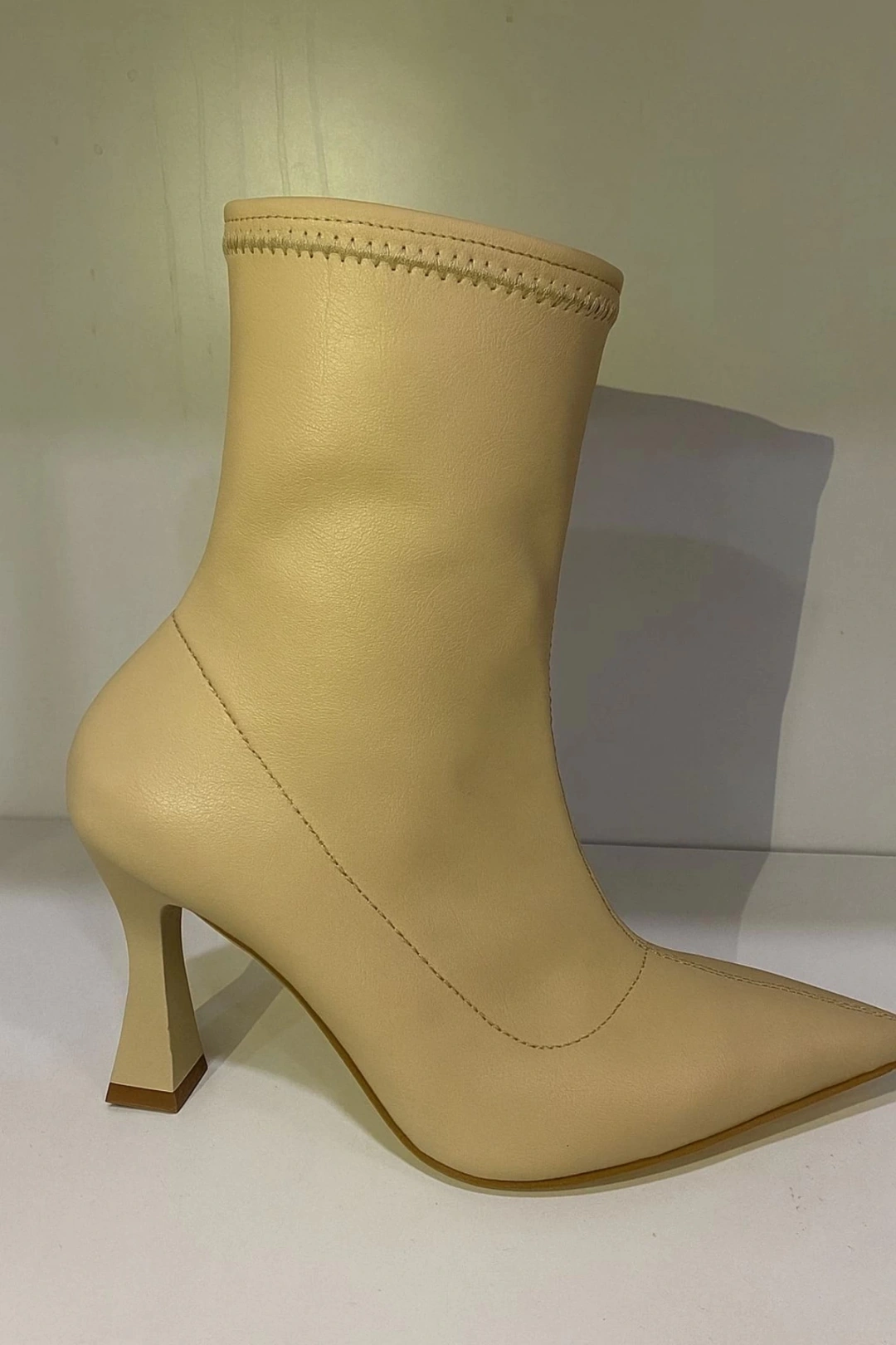 kadın bej streç deri sivri burun fermuar detaylı topuklu bot