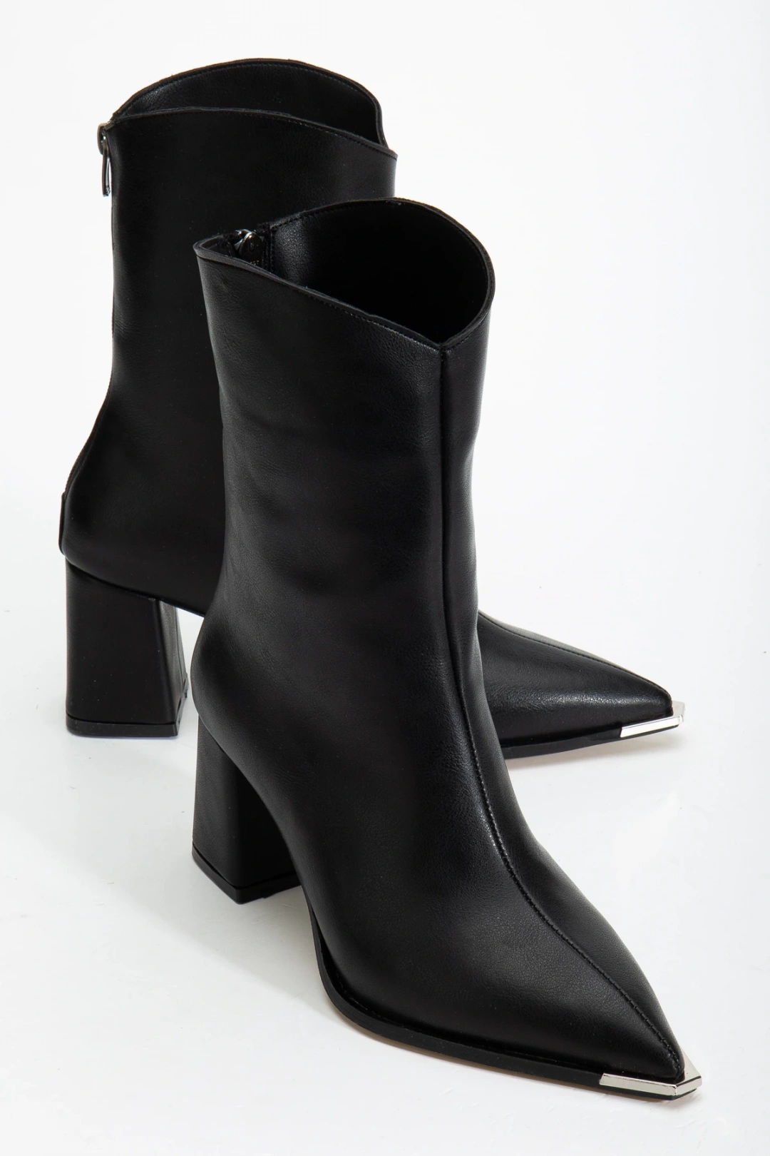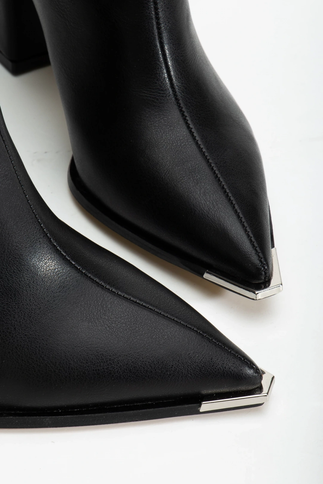 kadın siyah streç deri sivri burun fermuar detaylı topuklu bot