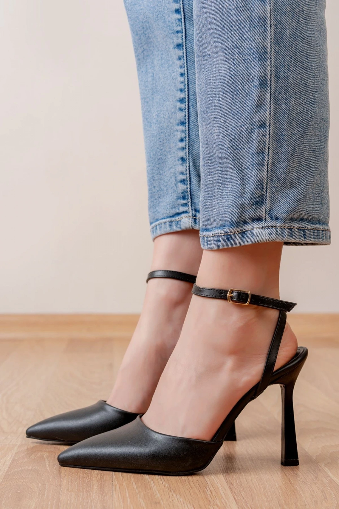 Kadın Bej Deri Tokalı Sivri Şık Topuklu Stiletto Ayakkabı