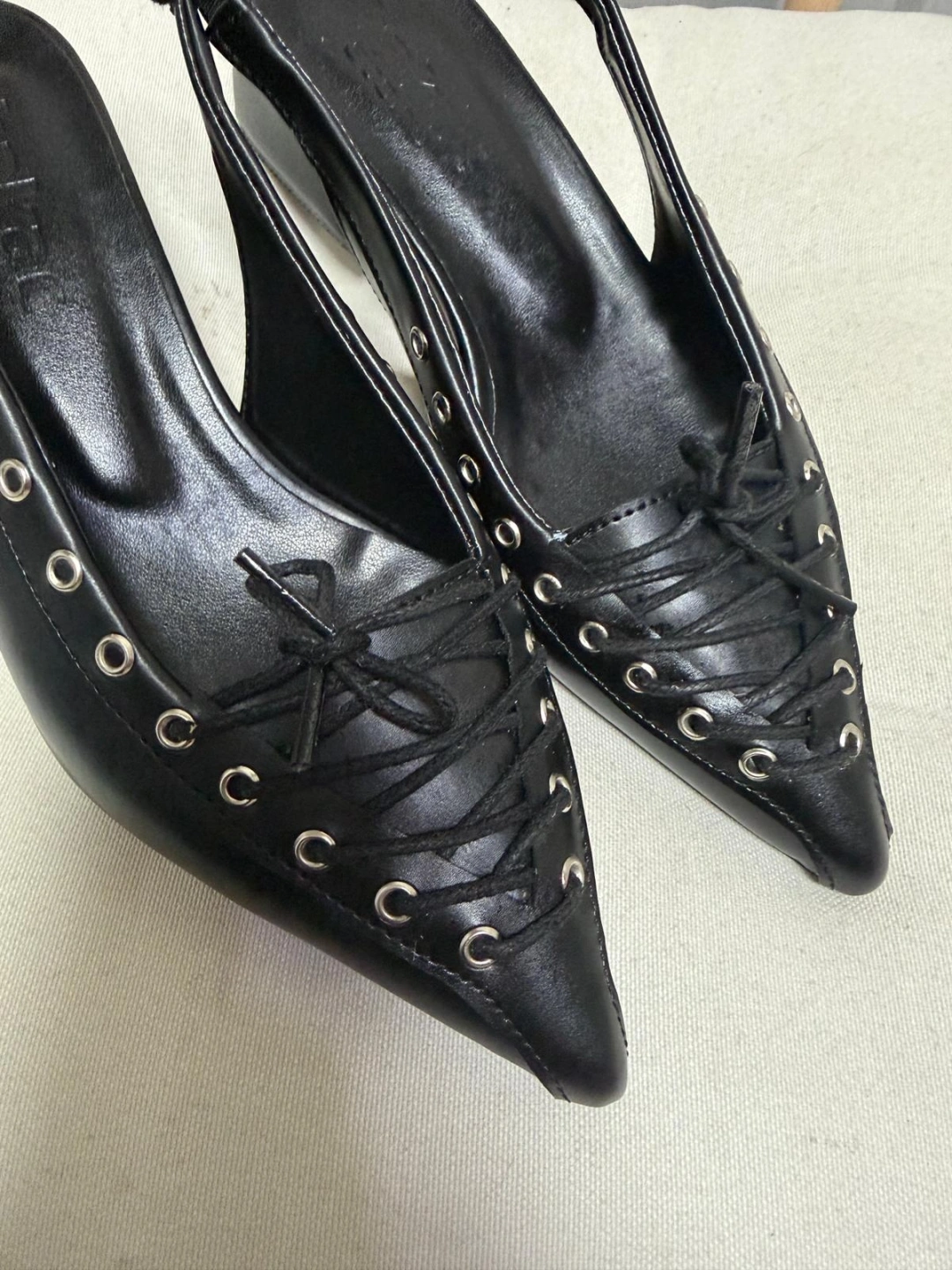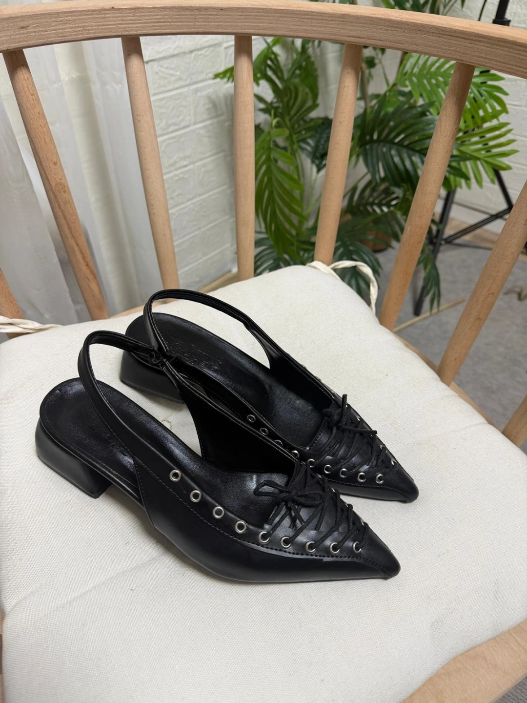 Kadın Siyah Deri Bağcık Detaylı Sivri Burun Şık Topuklu Ayakkabı