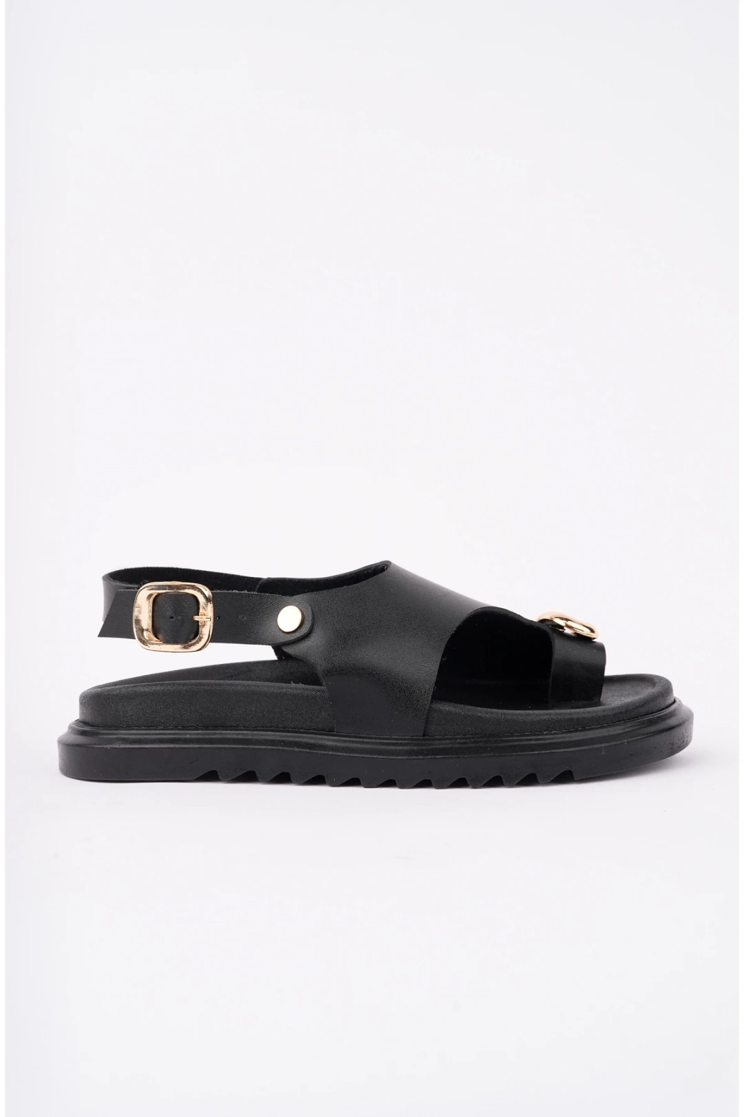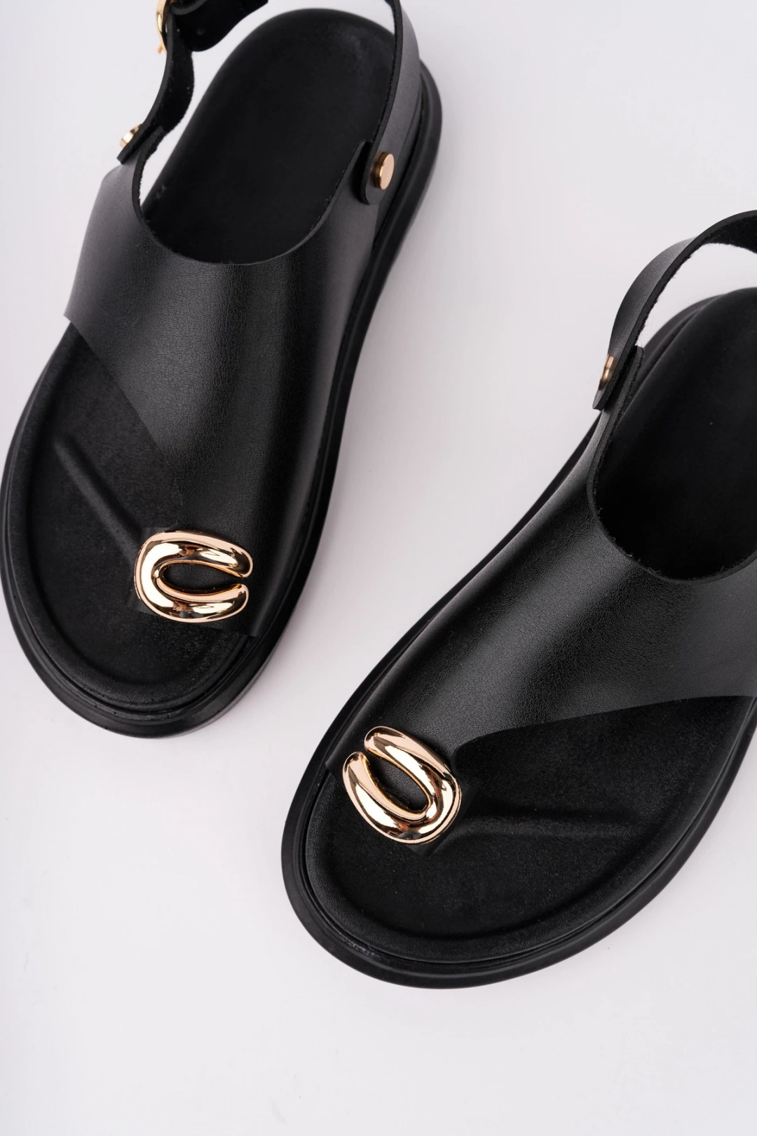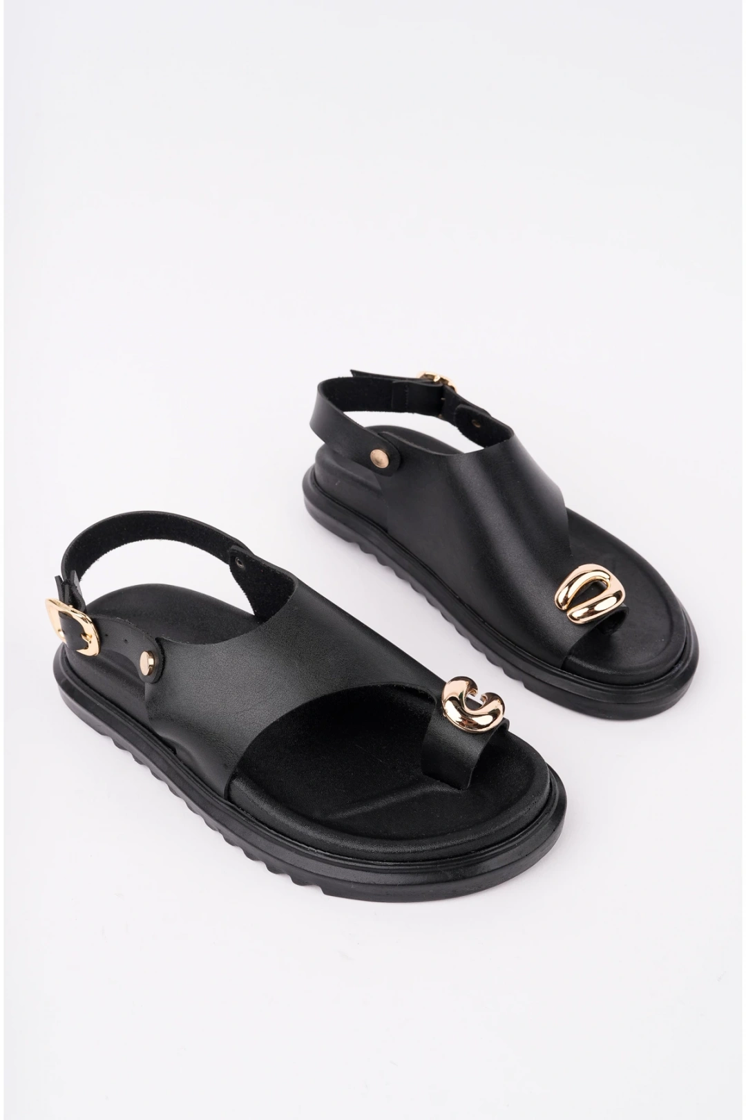 Kadın Siyah Günlük Gold Yüzük Parmak Arası Toka Detaylı Sandalet