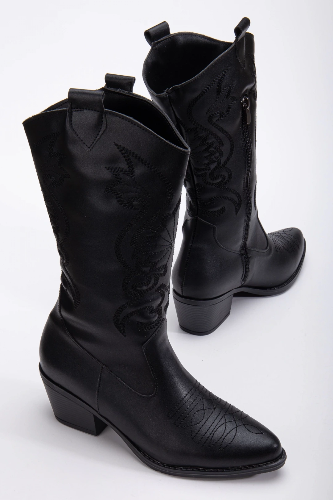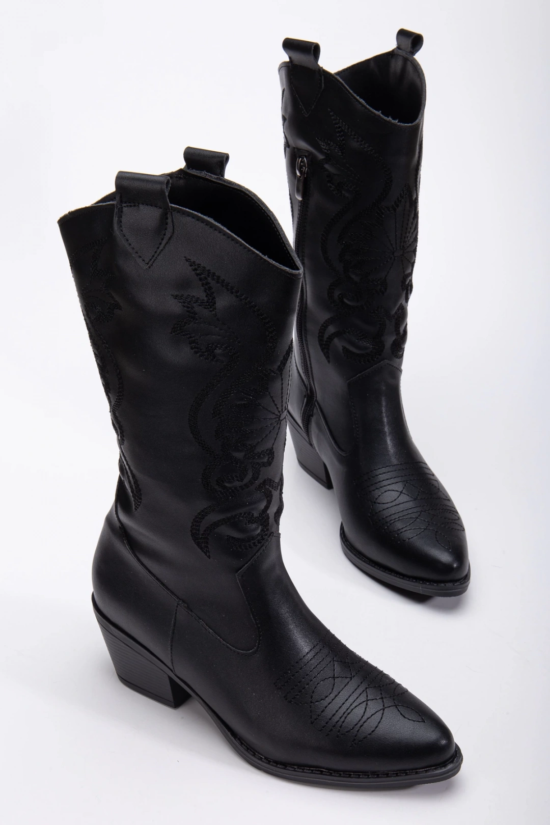 Kadın Siyah Deri Özel Nakış Fermuar Detaylı Kovboy Çizme