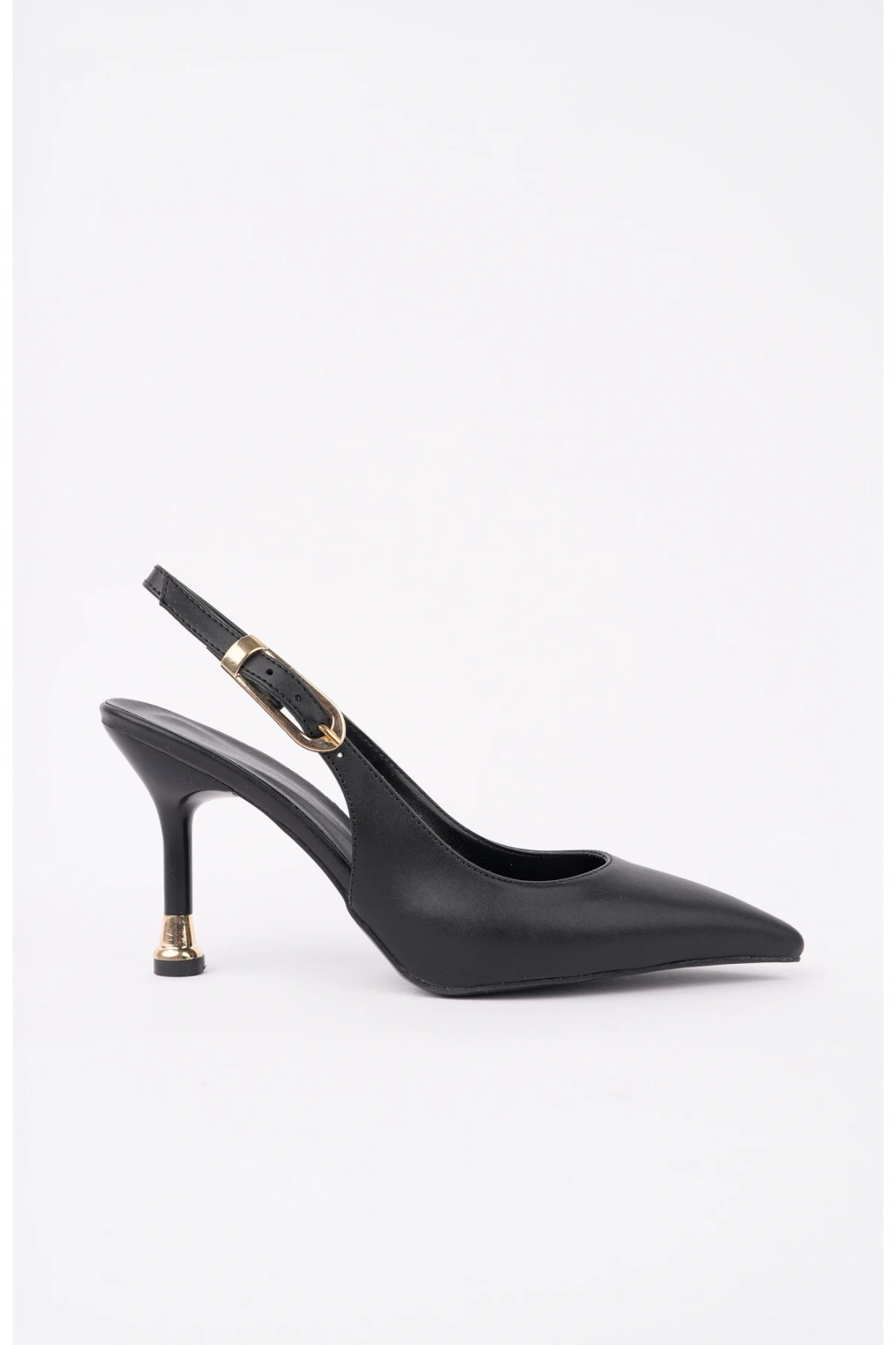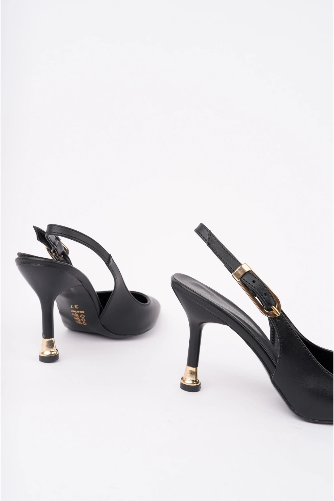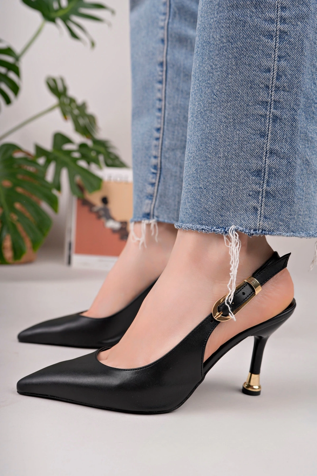 Kadın Siyah Deri Tokalı Sivri Şık Topuklu Stiletto Ayakkabı