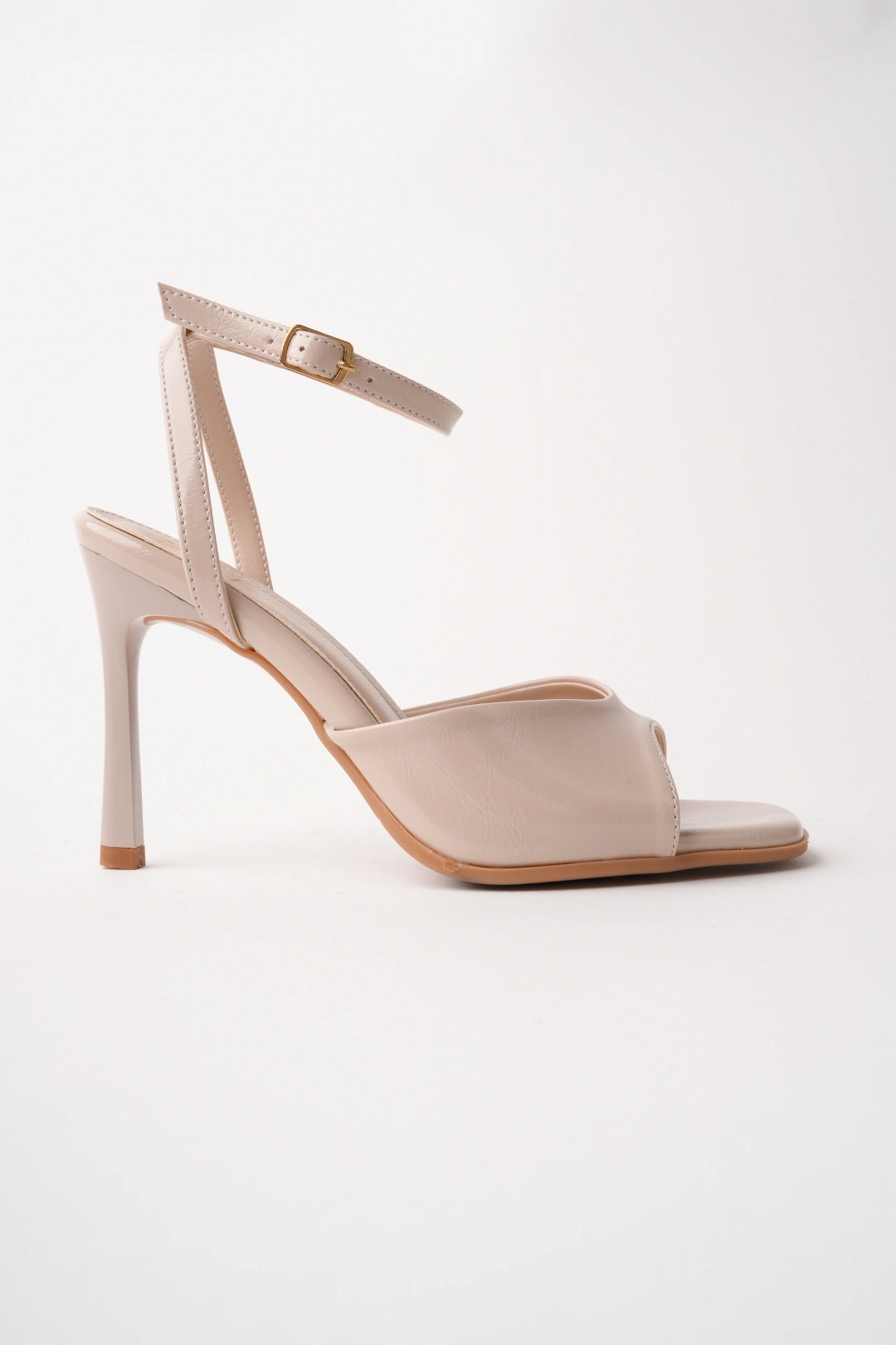 Kadın Bej Rengi Kırışık Rugan Önü Açık Tek Bantlı Topuklu Ayakkabı