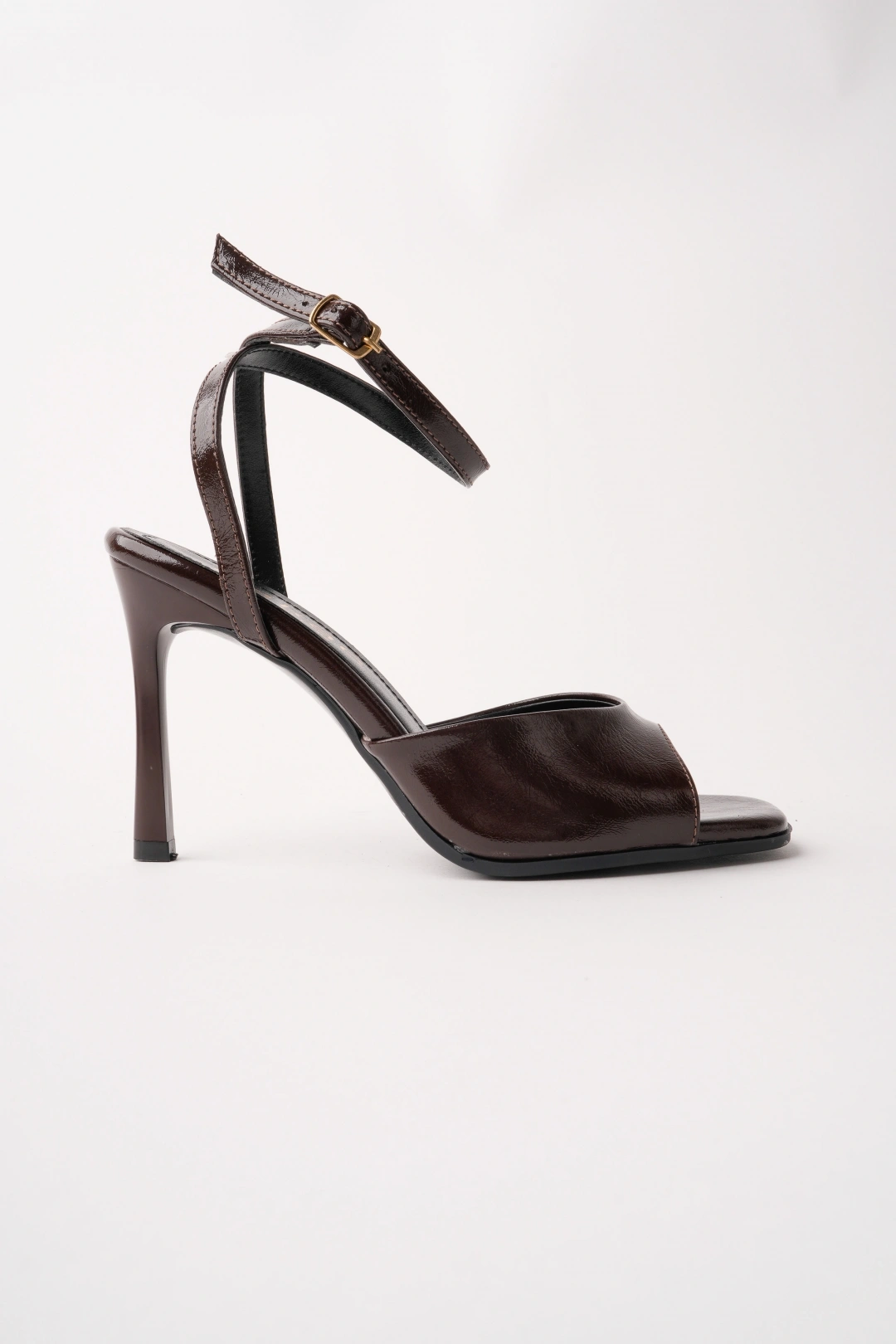 Kadın Kahverengi Kırışık Rugan Önü Açık Tek Bantlı Topuklu Ayakkabı