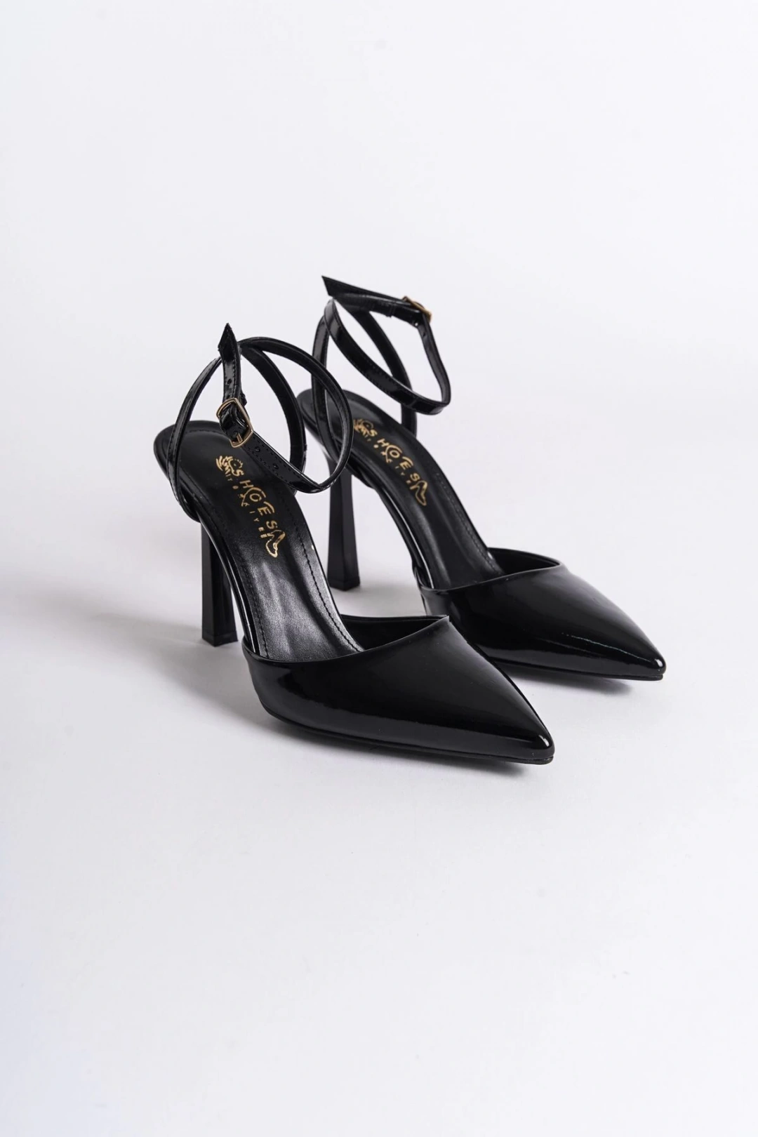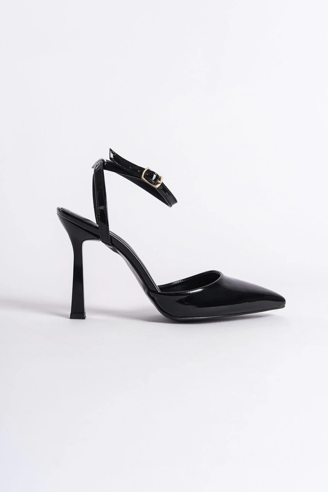 Kadın Siyah Rugan Tokalı Sivri Burun Şık Topuklu Stiletto Ayakkabı