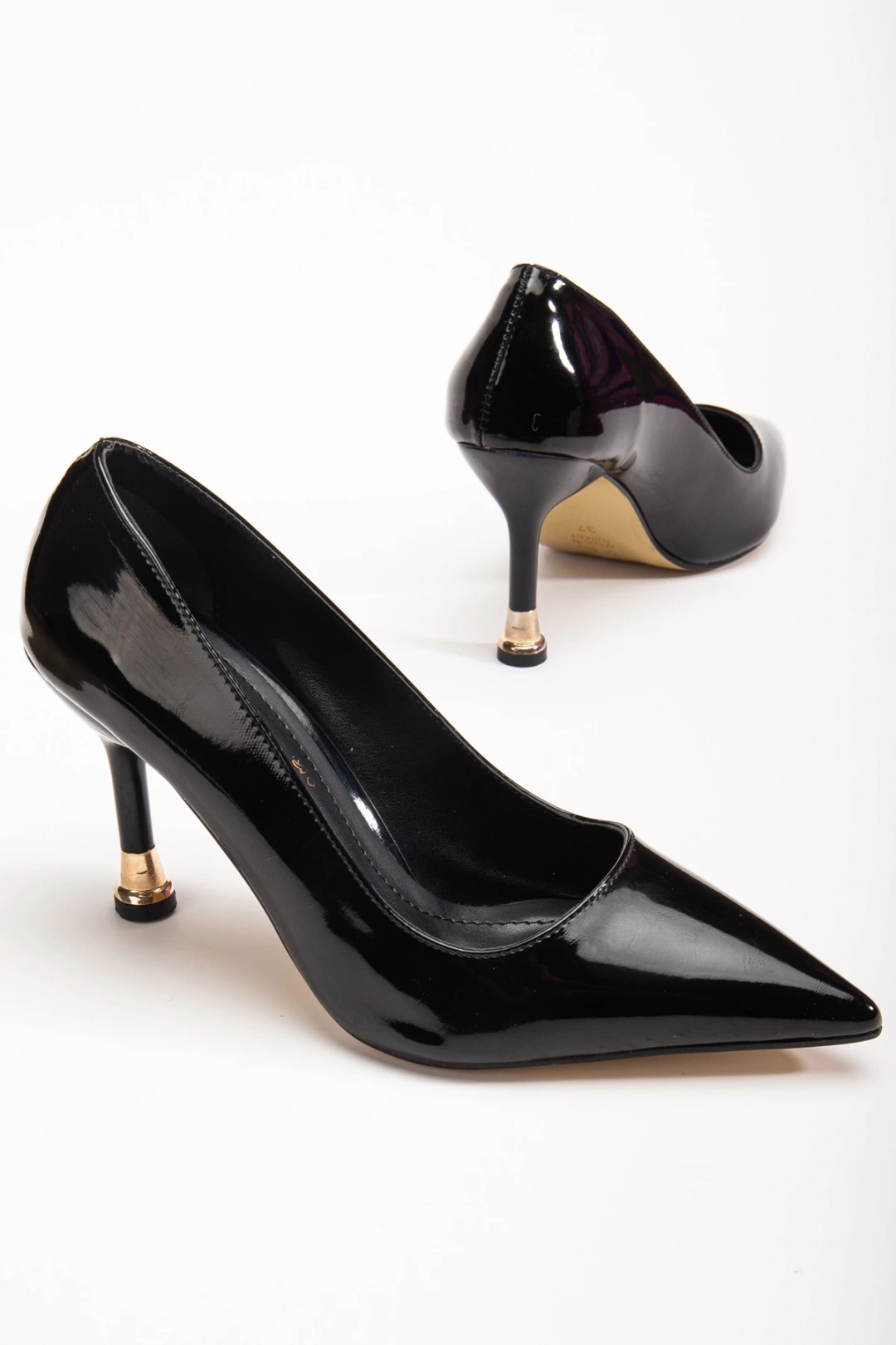 Kadın Siyah Rugan Arkası Kapalı Gold Ökçe Detaylı Topuklu Ayakkabı