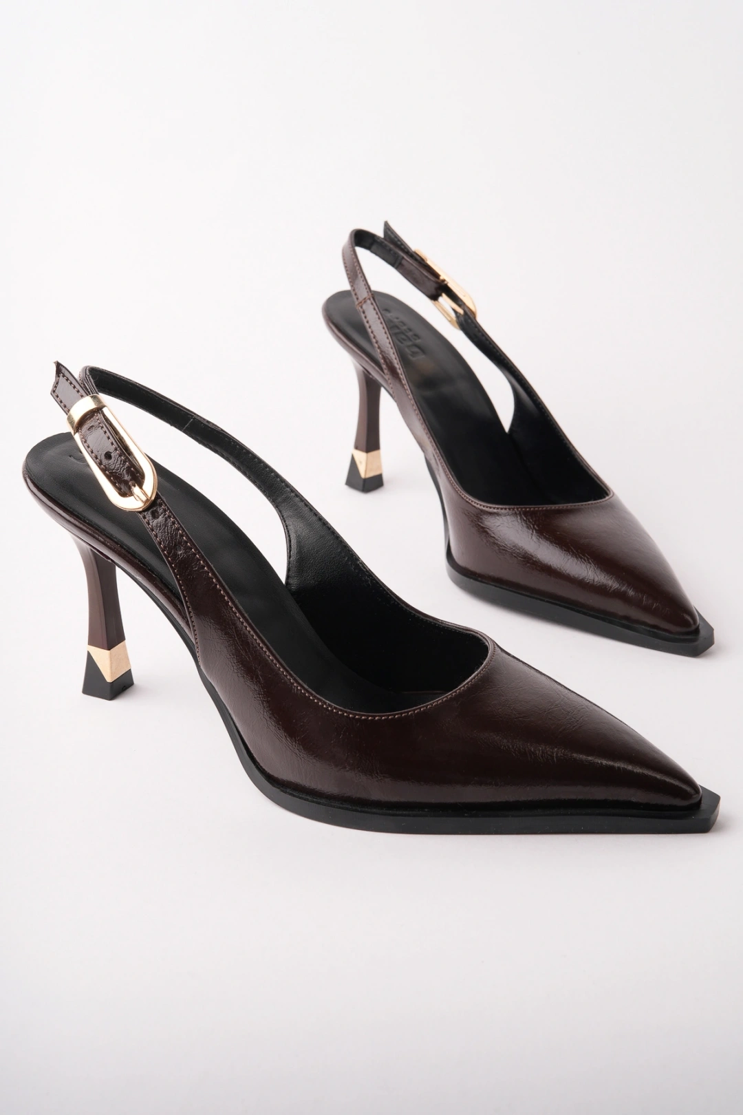 Kadın Kahverengi Kırışık Rugan Çift Biyeli Topuklu Ayakkabı