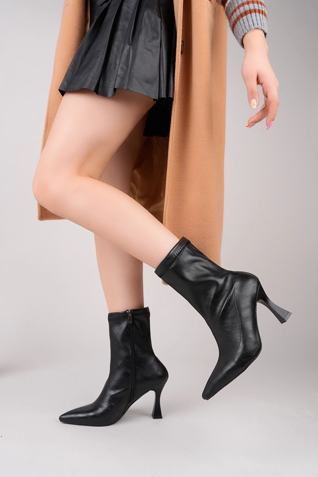 kadın siyah streç deri sivri burun fermuar detaylı topuklu bot