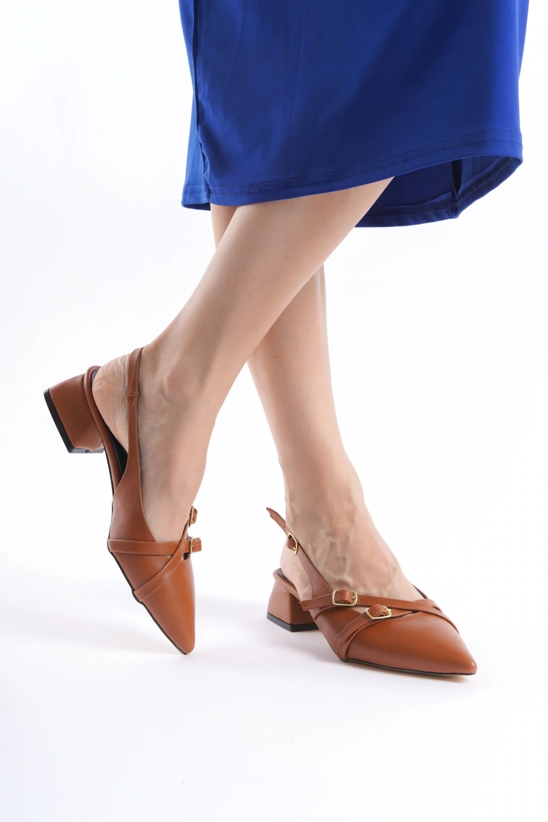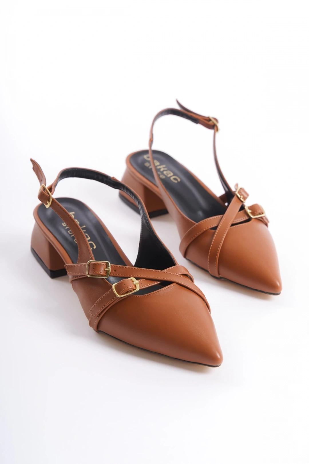 Kadın Taba Cilt Çapraz Bantlı Yeni Sezon Kısa Topuklu Ayakkabı
