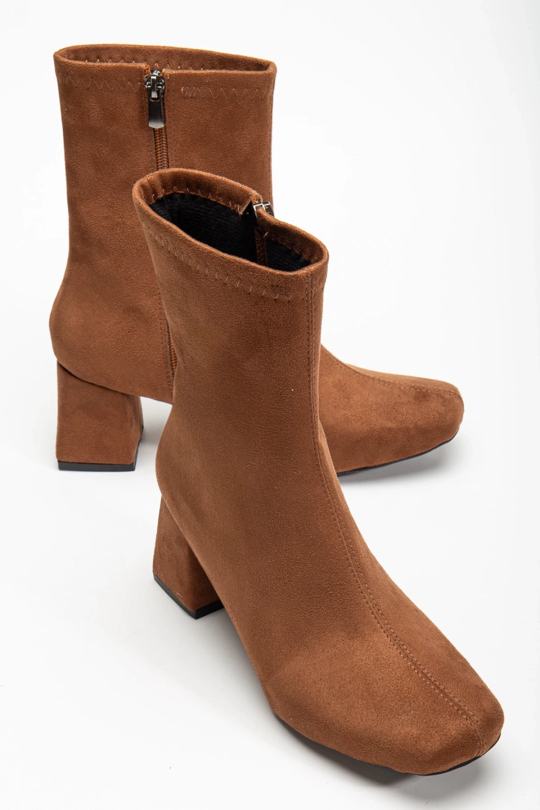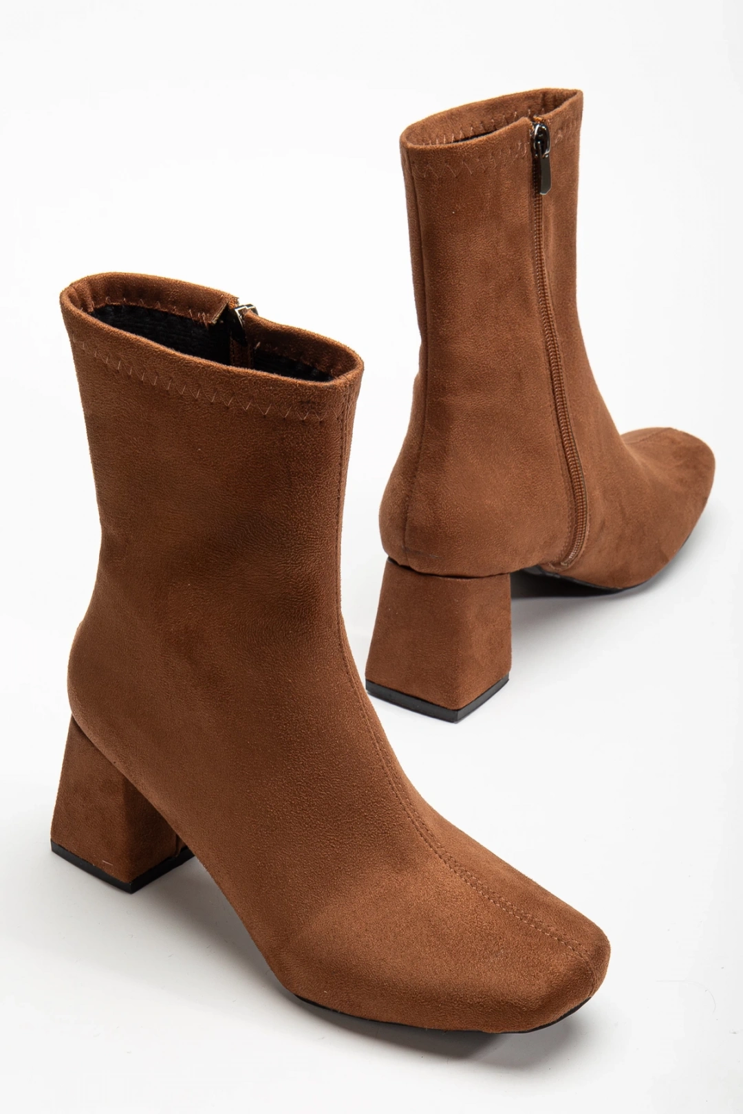 Kadın Orta Boy Küt Burun Streç Kumaş Topuklu Ayakkabı Acı Kahverengi