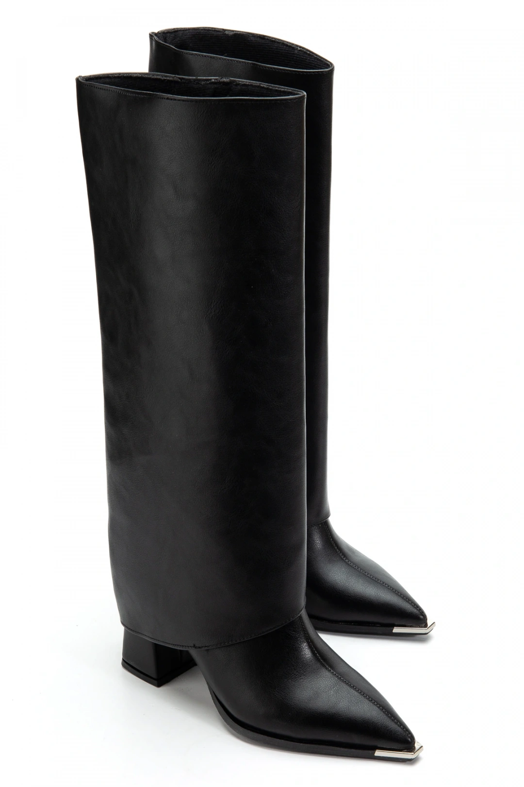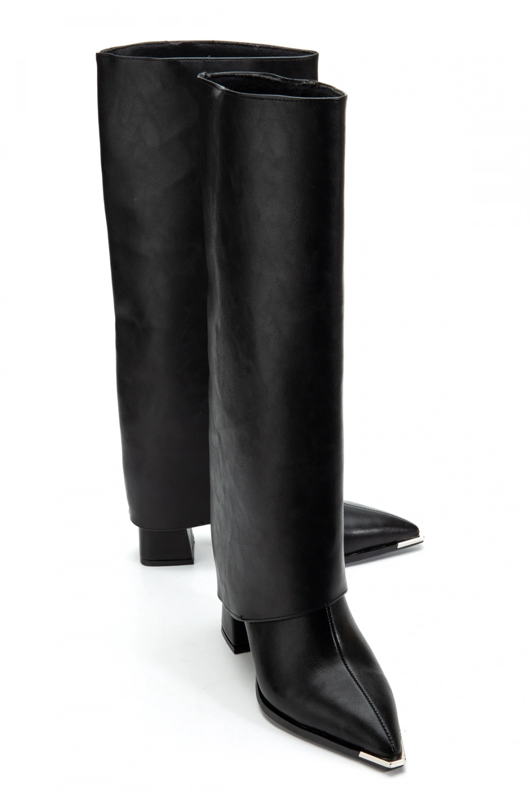 Kadın Takıp Çıkarılabilen Tozluk Detaylı Metal Sivri Burun siyah Deri Çizme