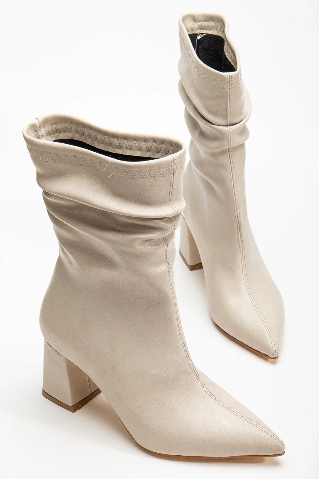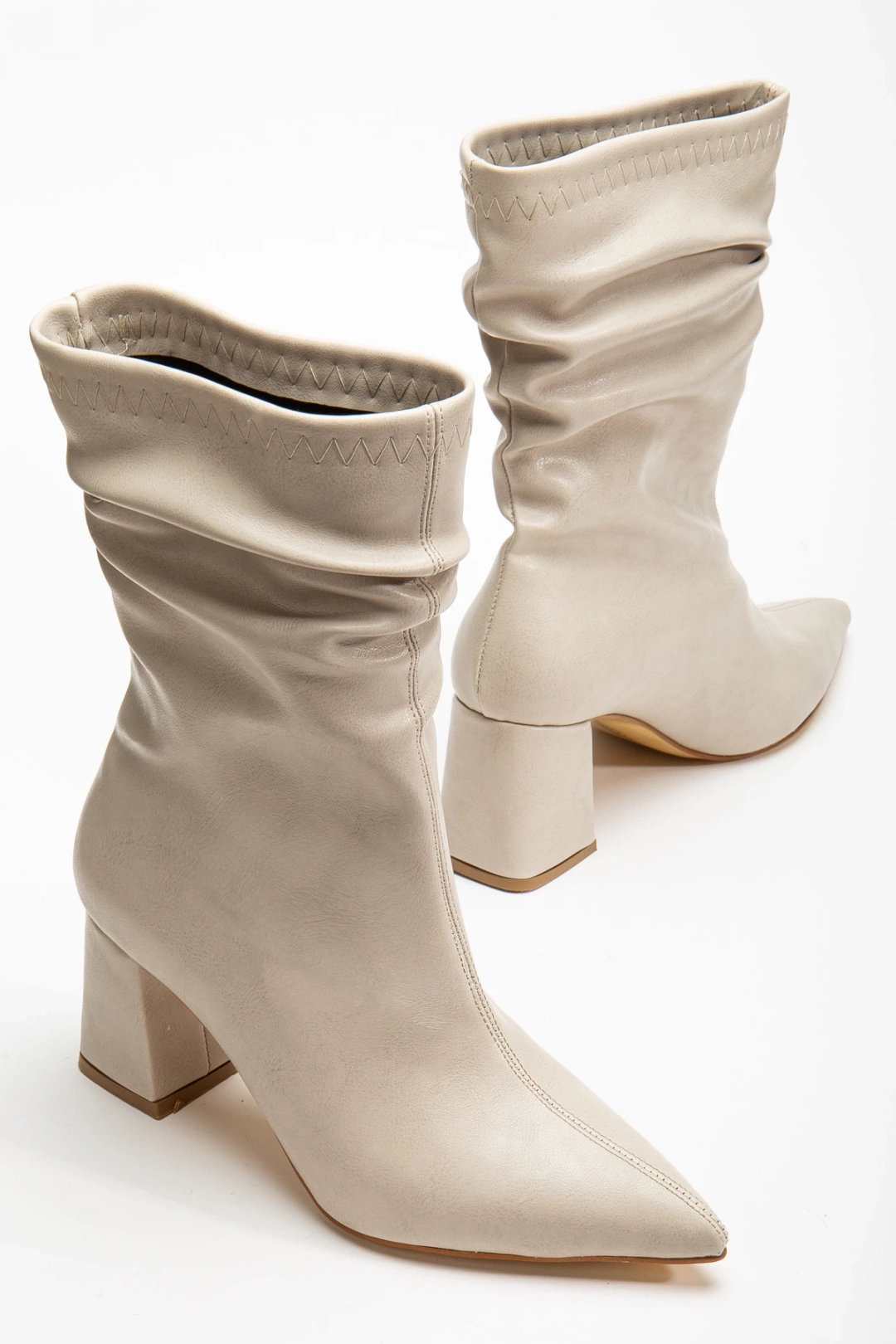 Noire Kadın Bej Deri Büzgülü Sivri Burun Kalın Topuklu Bot