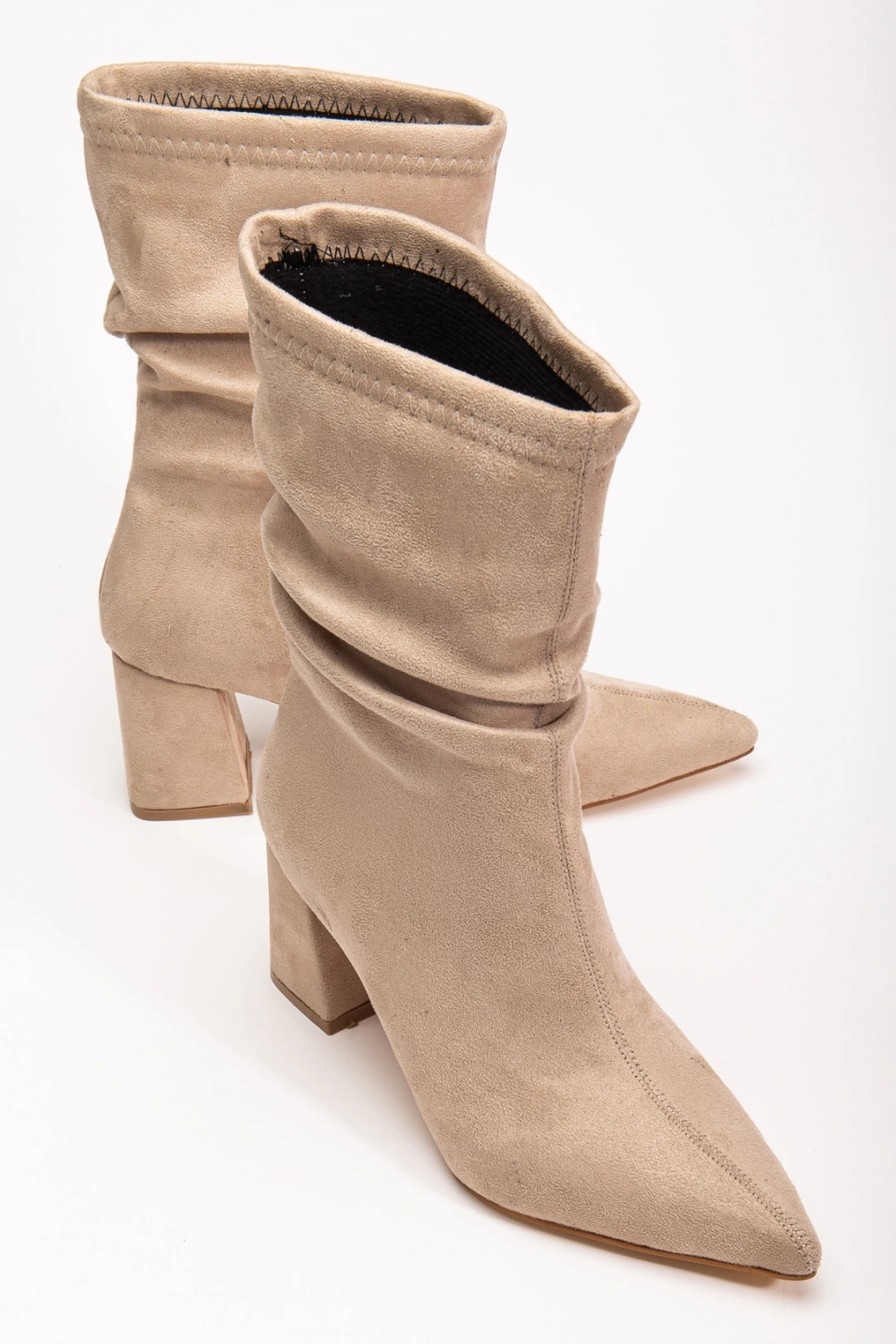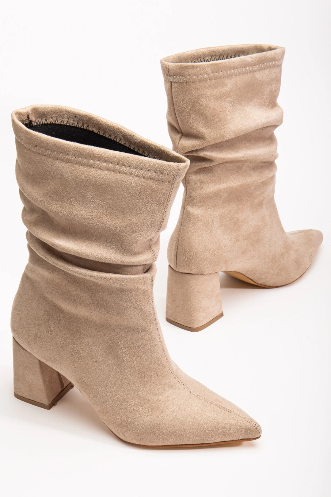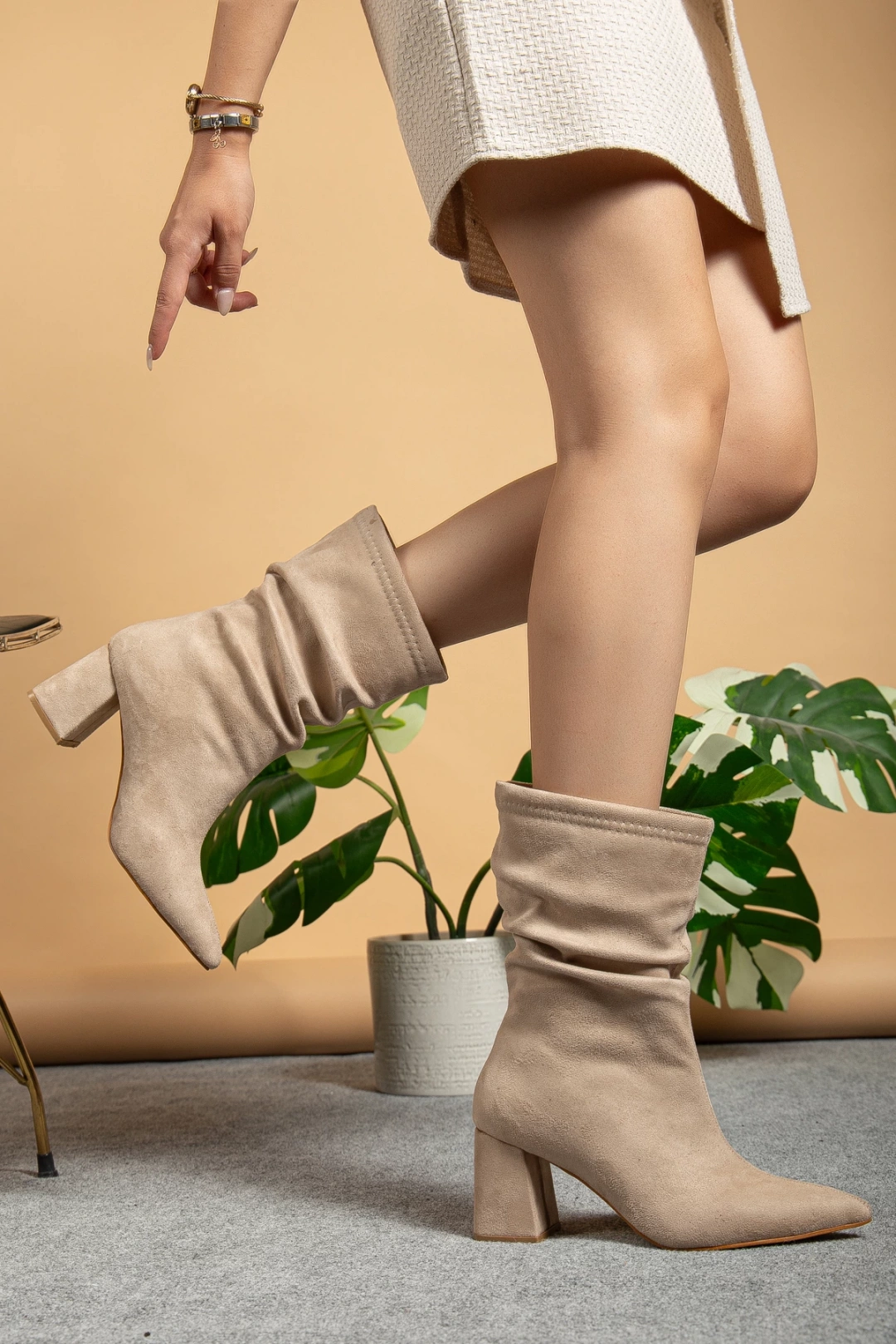 Noire Kadın Bej Süet Büzgülü Sivri Burun Kalın Topuklu Bot