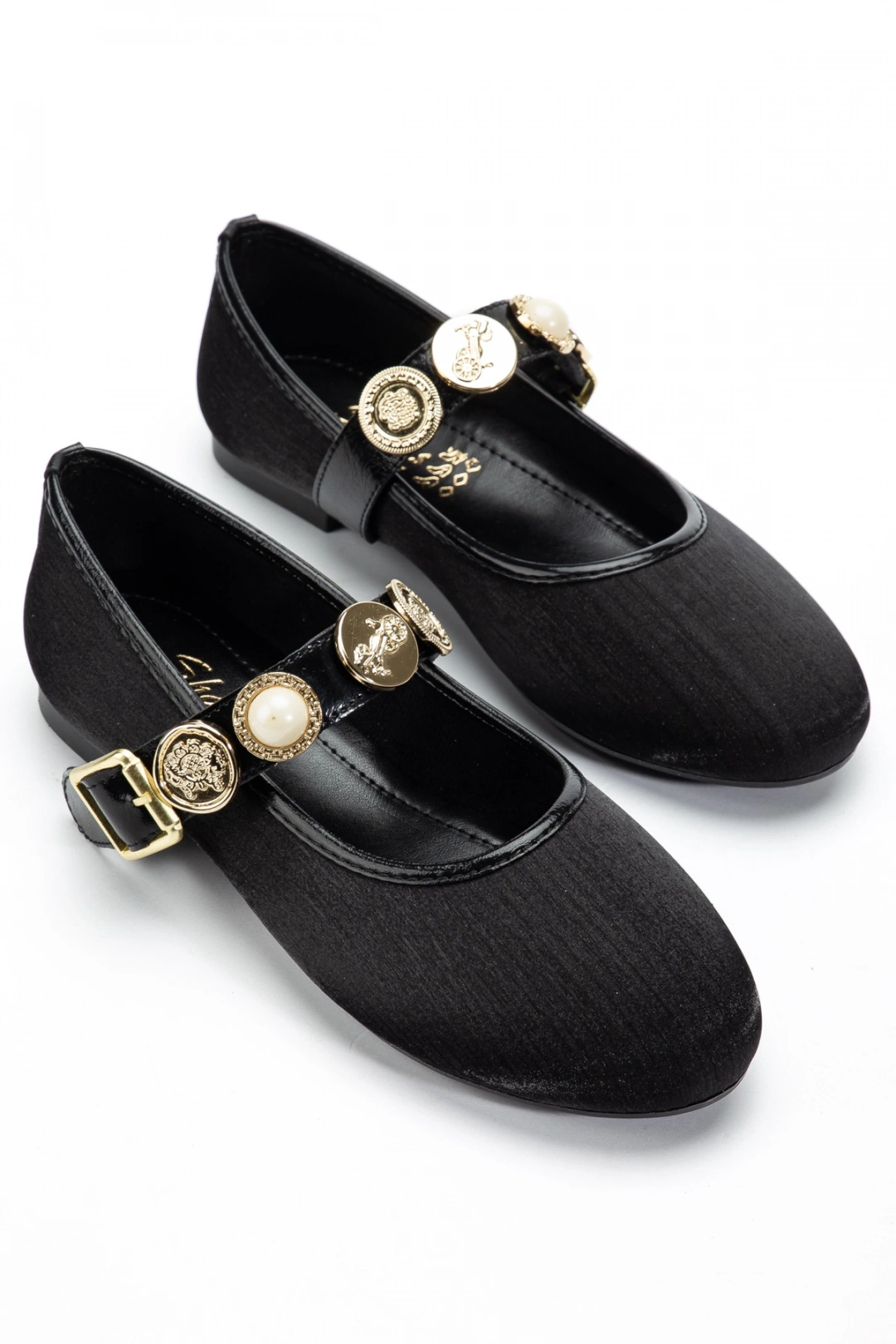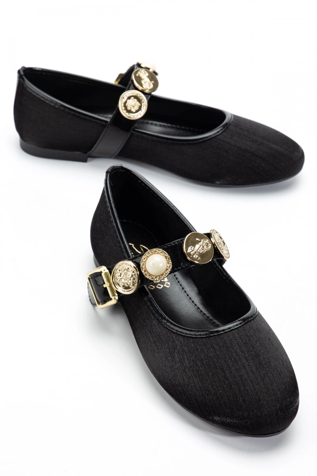 Kadın Siyah Gold Aksesuarlı Şık Parlak Kumaş Babet