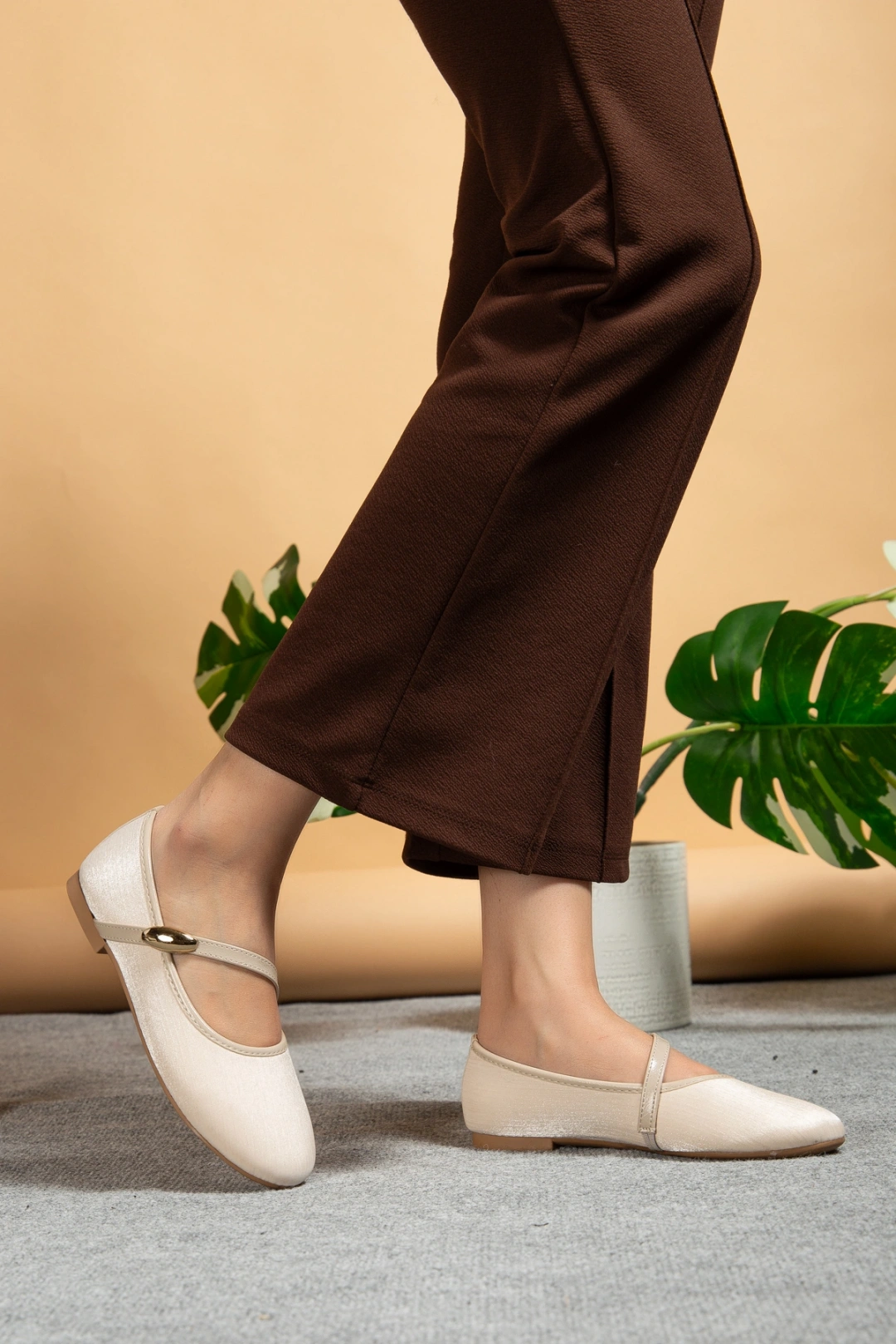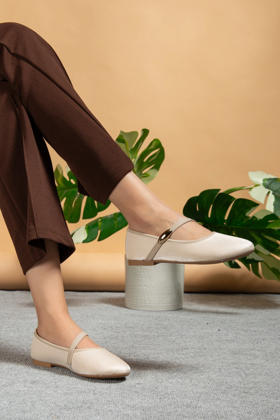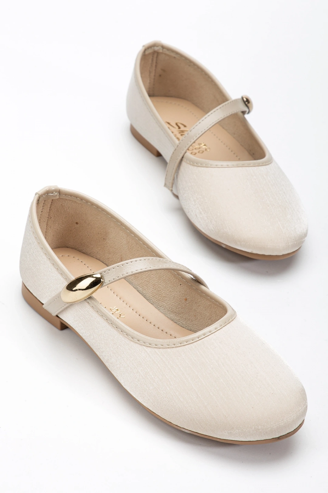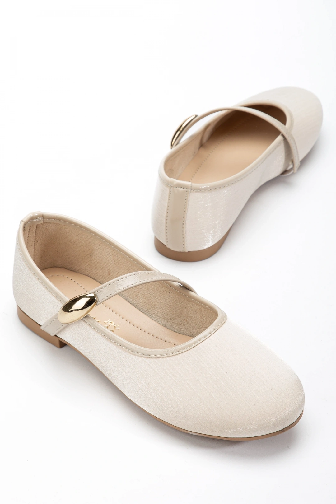 Kadın Bej Gold Aksesuarlı Şık Parlak Kumaş Babet